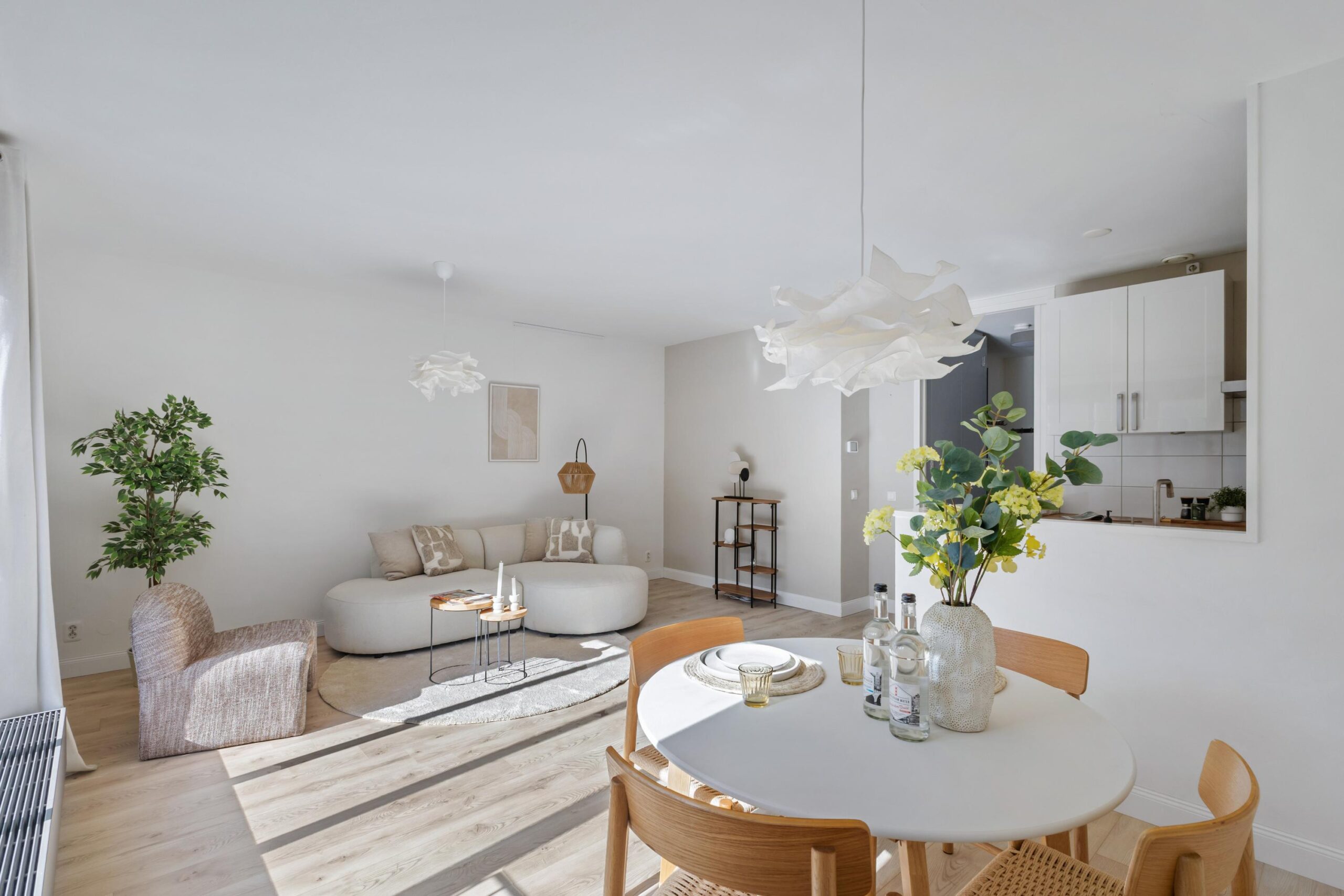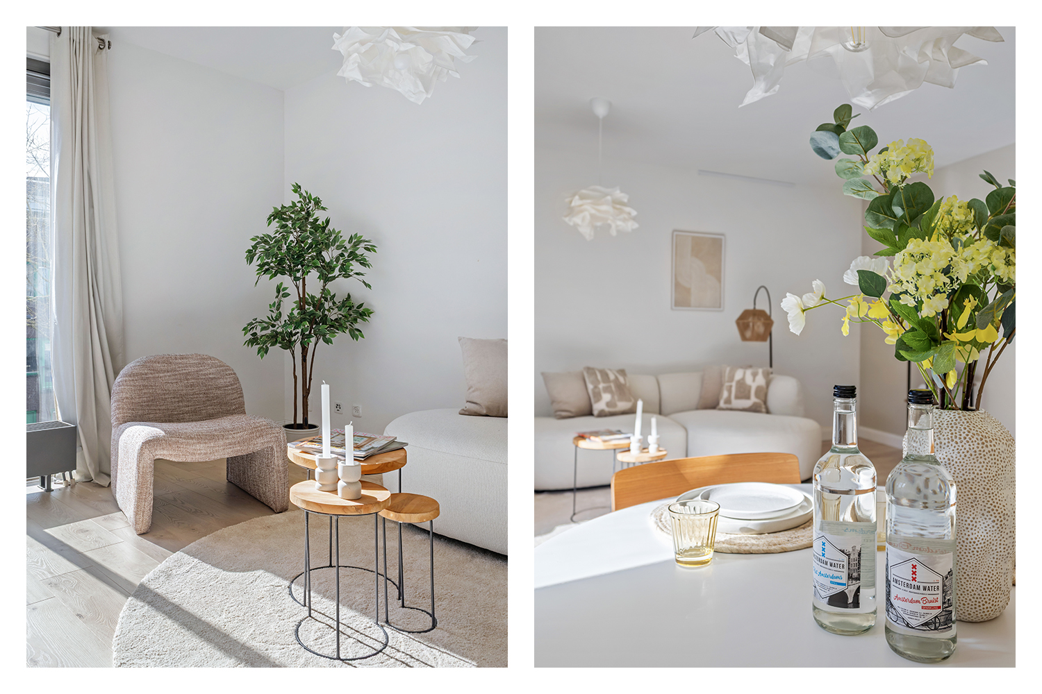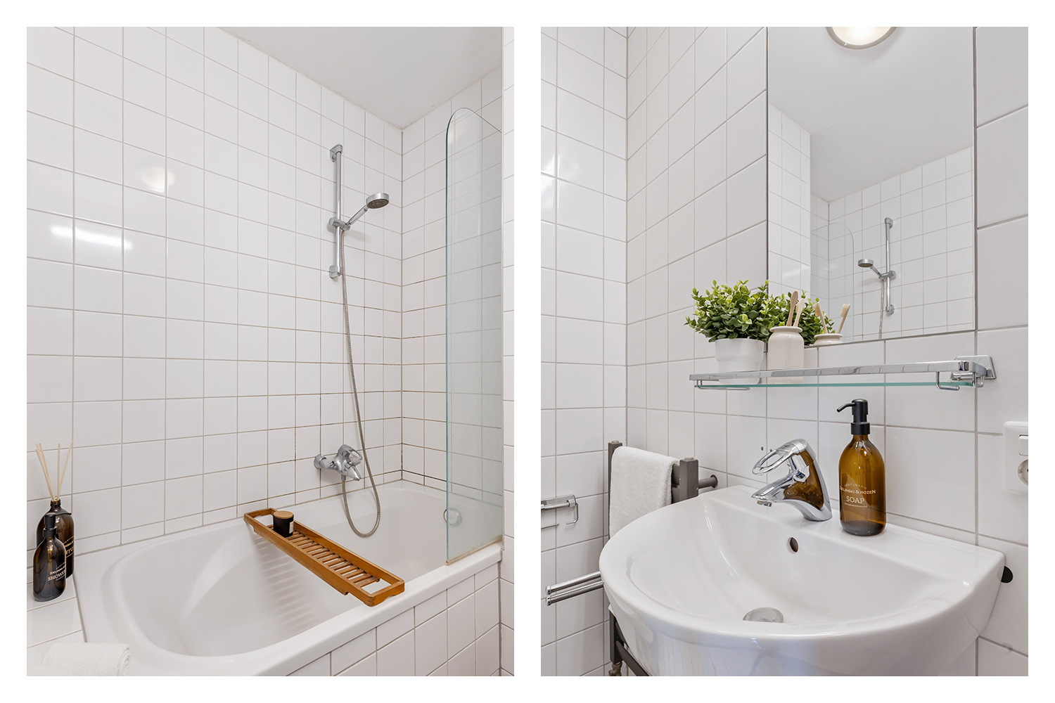 At the front is the living room with open kitchen. Thanks to the large windows across almost the entire width of the apartment, this is a bright and pleasant space. There is ample room for a comfortable seating area and a dining table.