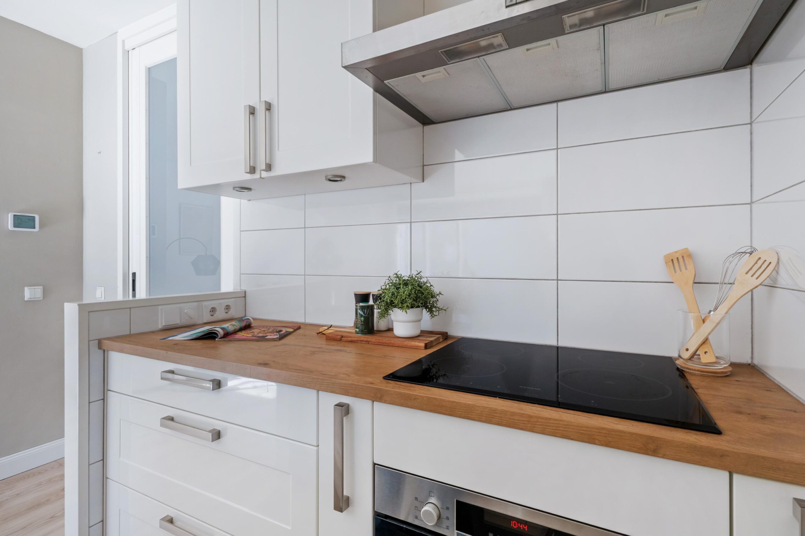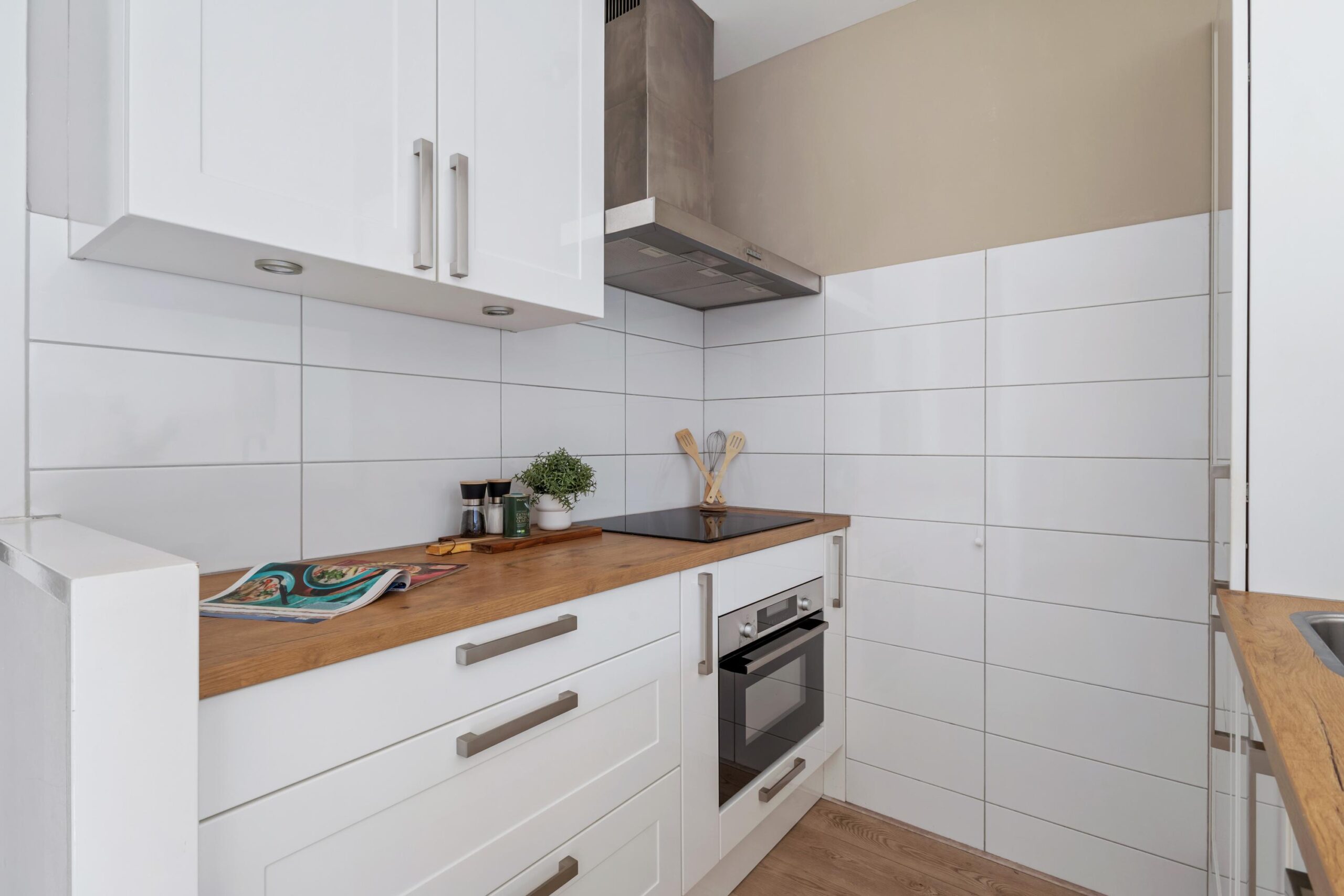 De open keuken sluit mooi aan op de woonkamer en is voorzien van diverse inbouwapparatuur, waaronder een keramische kookplaat, afzuigkap, magnetron/oven en vaatwasser.