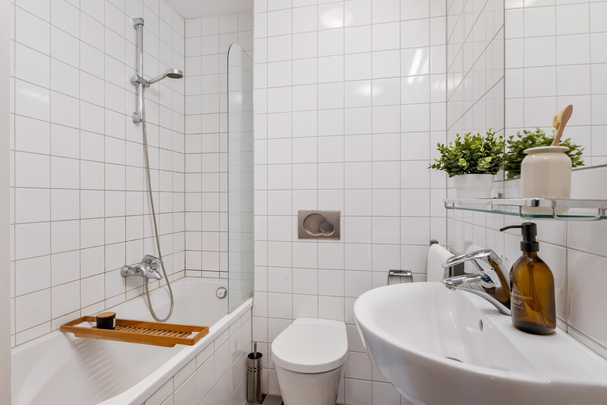 The bathroom is fully equipped with a bathtub, toilet and washbasin.