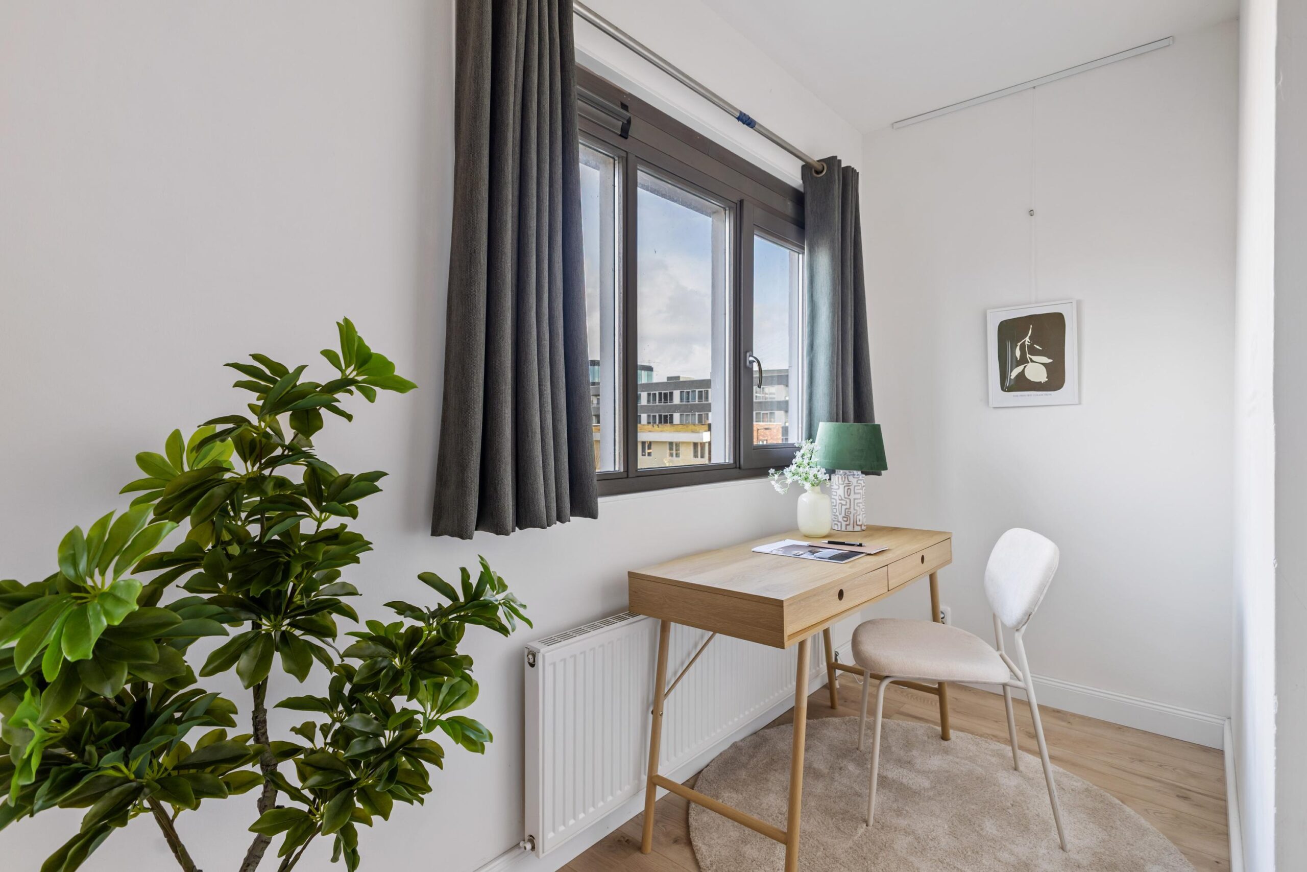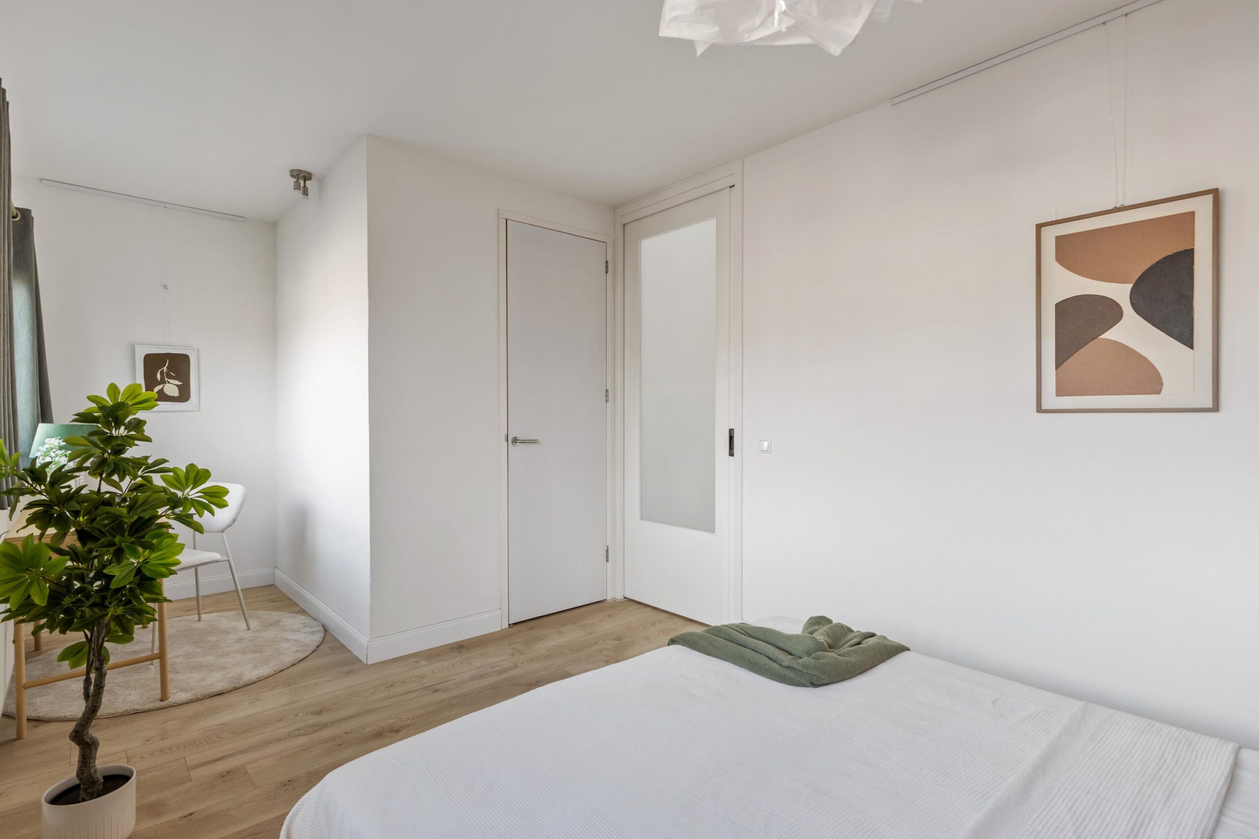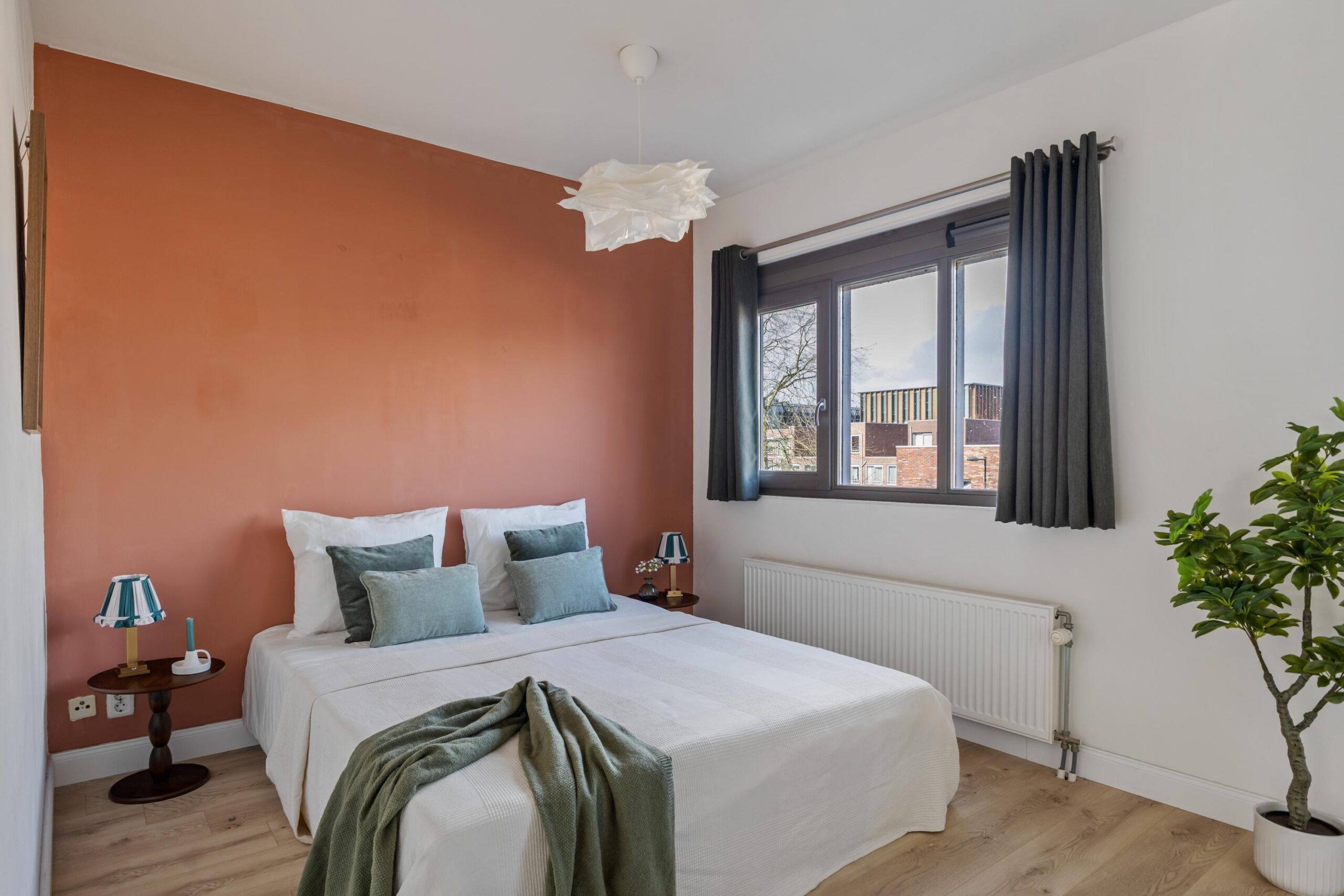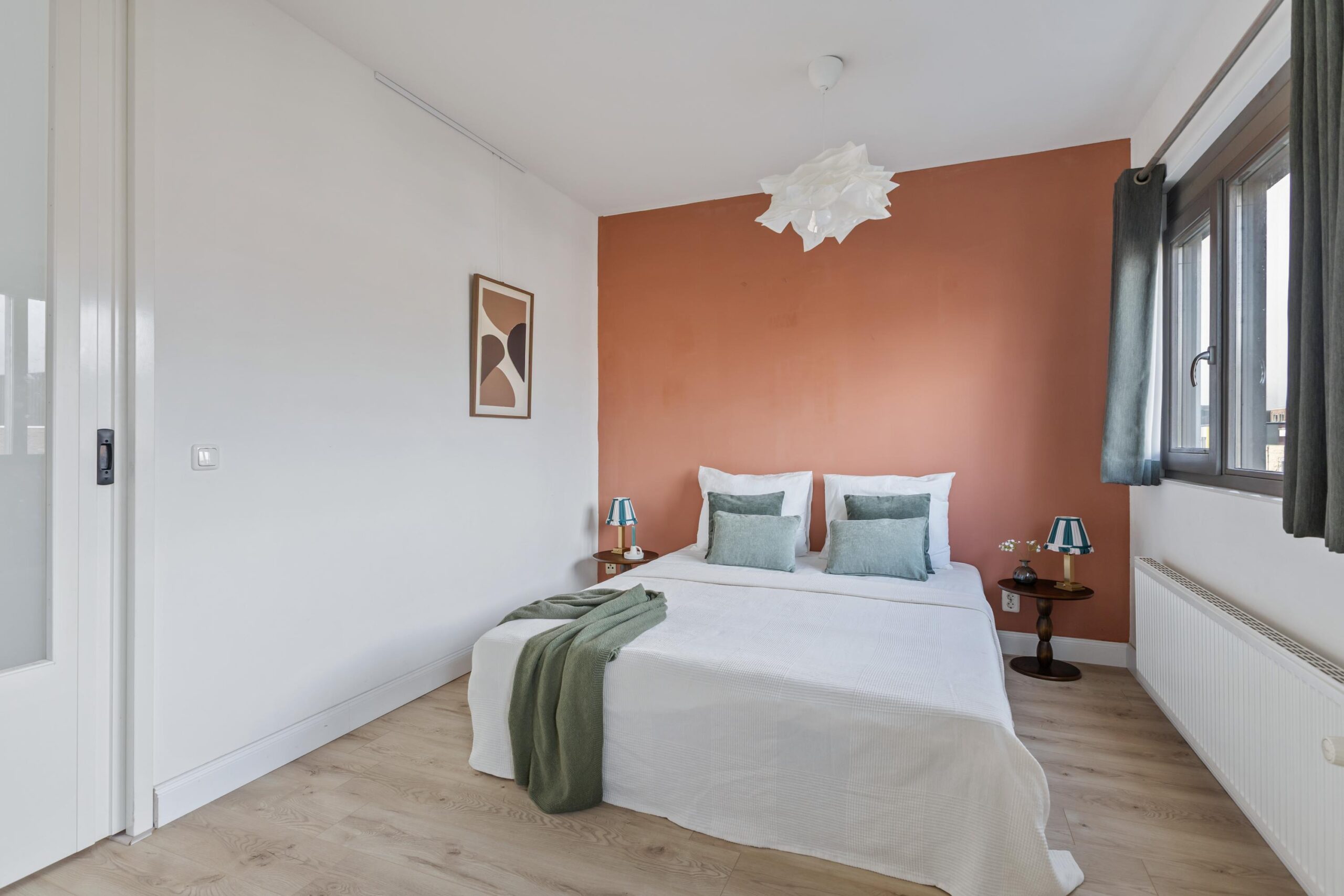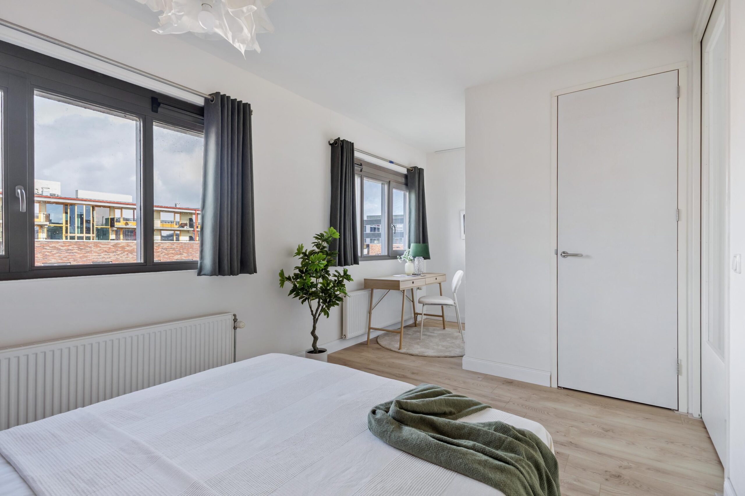 Aan de achterzijde ligt de ruime slaapkamer met uitzicht op de groene binnentuinen. Deze kamer is groot genoeg om eenvoudig op te splitsen in twee slaapkamers, waardoor de woning ook geschikt is voor woningdelers of werken vanuit huis. Nu is de slaapkamer zo ingedeeld dat er een werkhoek en slaapruimte is. Daarnaast een ideale walk-in closet met veel kastruimte.