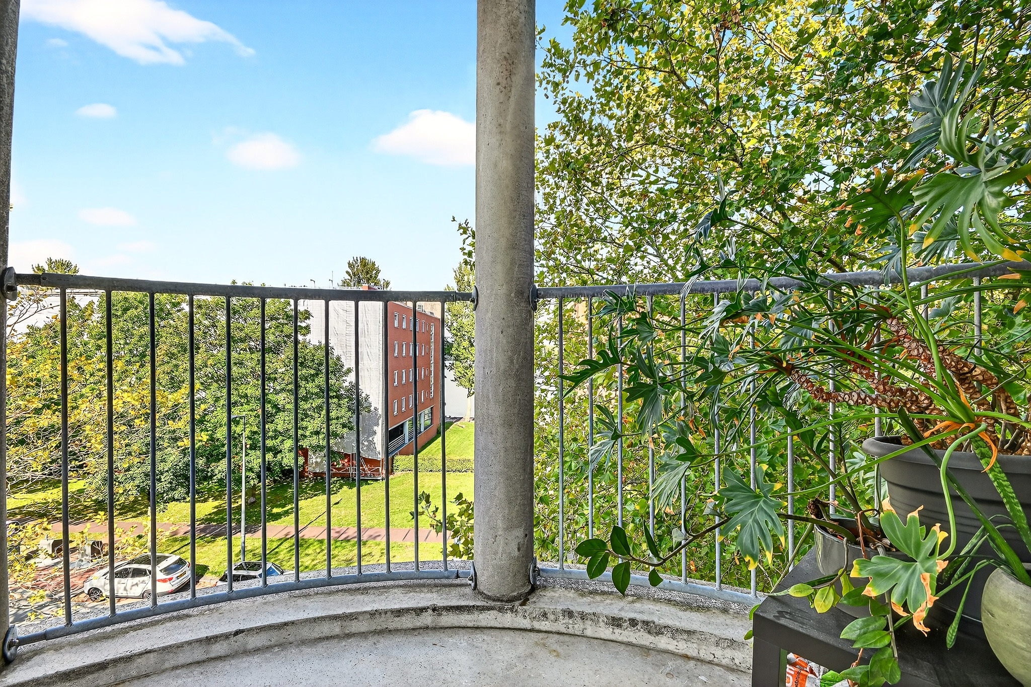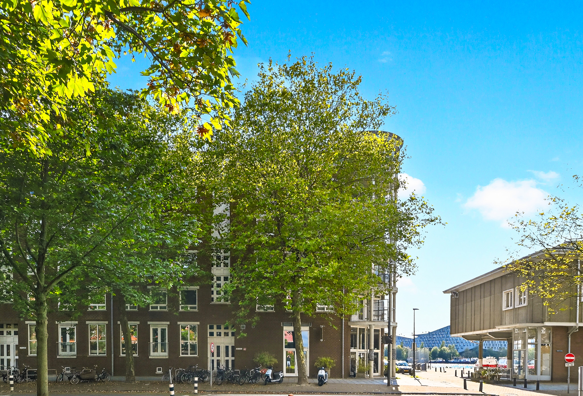 The well-maintained staircase with large moving windows leads to the third-floor flat. The bright living room has large windows and a door to the balcony with a view over the IJ, a wonderful place to enjoy the evening sun. The solid oak floor and playful layout create a warm and open atmosphere. At the rear is the spacious kitchen with a tasteful kitchen equipped with built-in appliances. The kitchen is finished with concrete paint and a concrete ciré worktop and overlooks the beautifully landscaped communal courtyard garden.