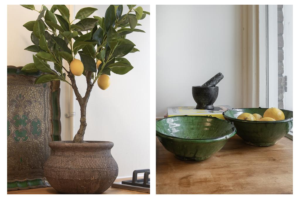 The modern kitchen is smartly designed and combines functionality with style. The solid wood countertop gives the kitchen a warm look, while the black-and-white tiles add a timeless and playful touch. The kitchen opens directly to the garden, perfect for enjoying a sunny day meal outside.