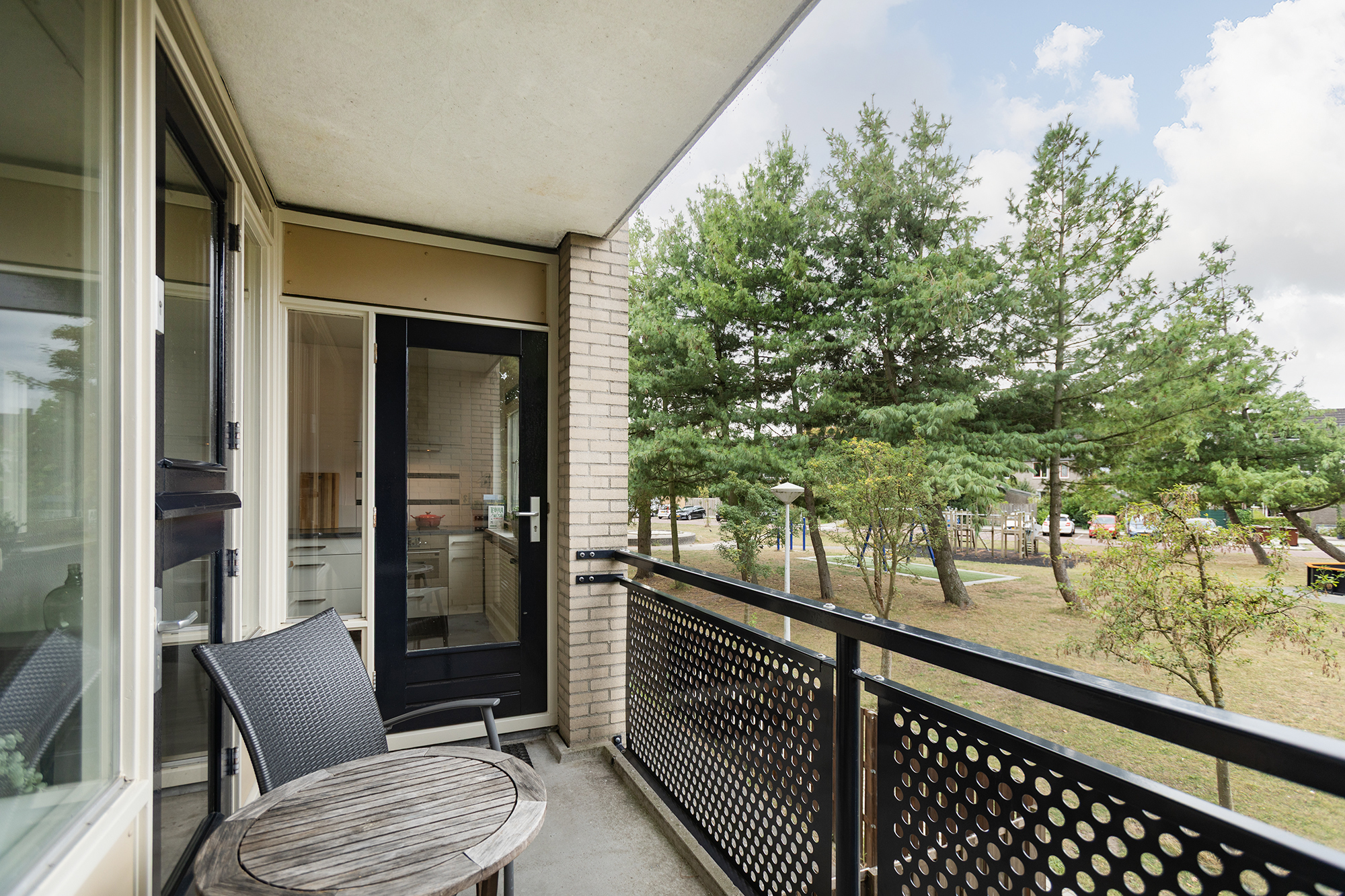 Aan de achterzijde van het complex ligt een heerlijk balkon op het zuiden. Dit balkon grenst aan de keuken en woonkamer en is vanuit beide ruimtes toegankelijk. Dankzij de ligging kun je hier heerlijk zitten van de vroege lente tot ver in de herfst.