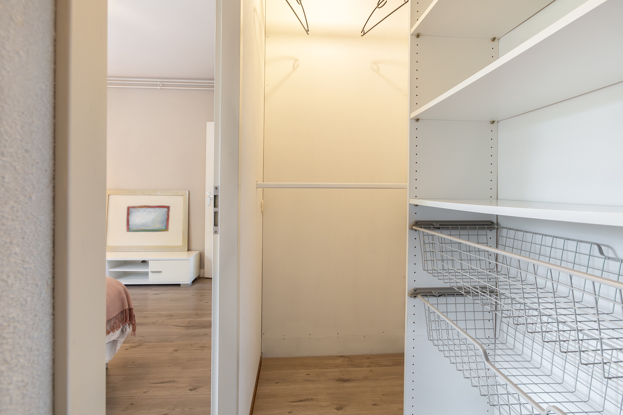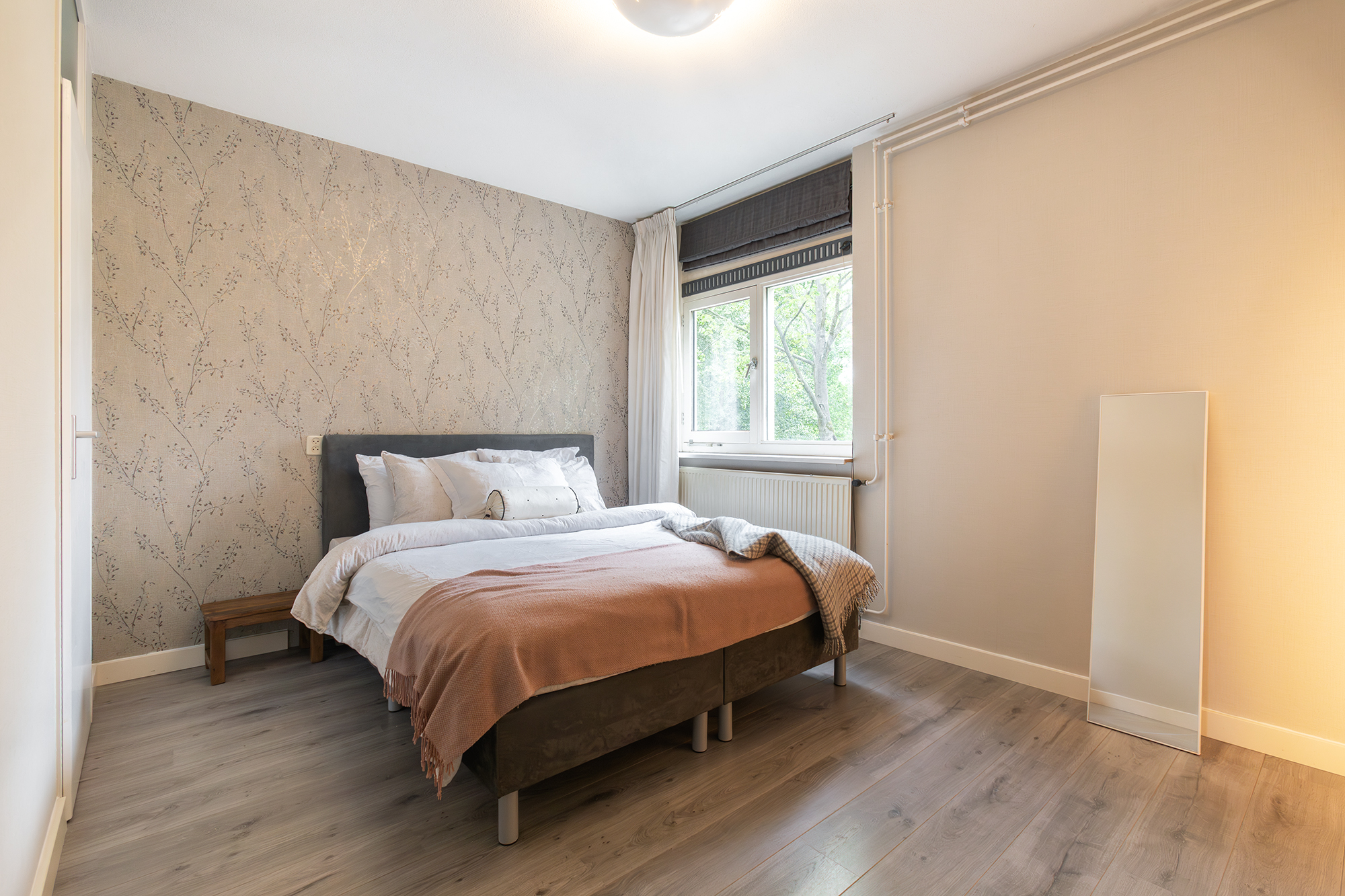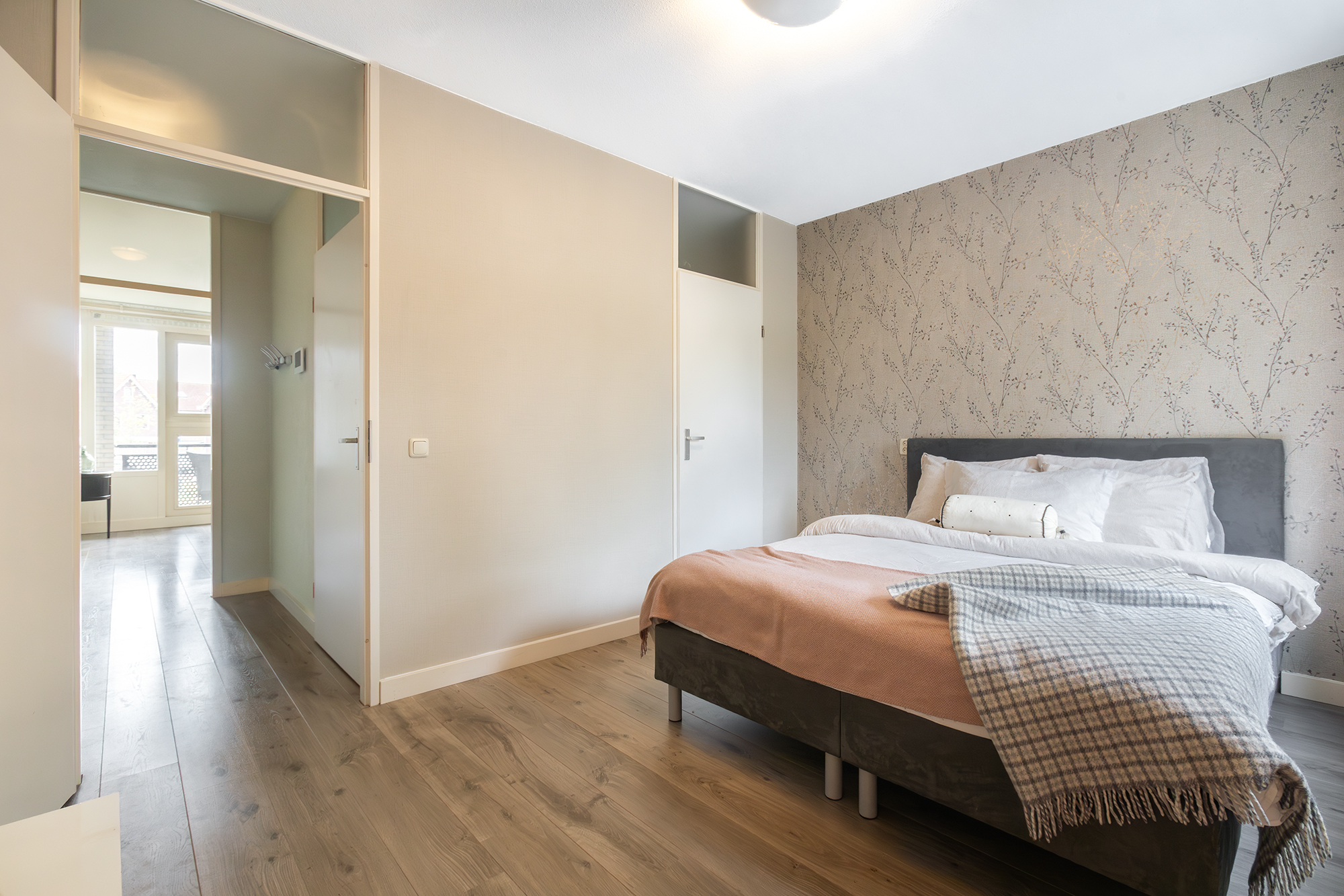 De ruime slaapkamer ligt aan de rustige voorzijde van de woning en heeft een walk-in-closet.