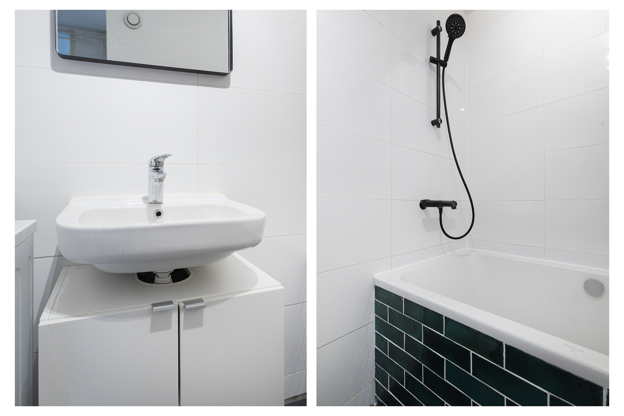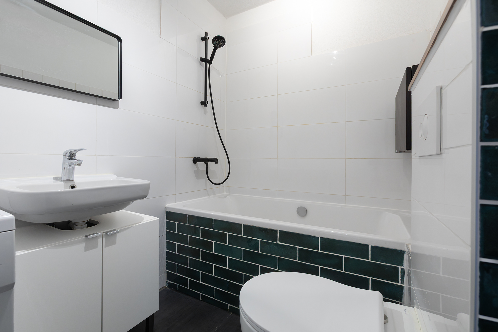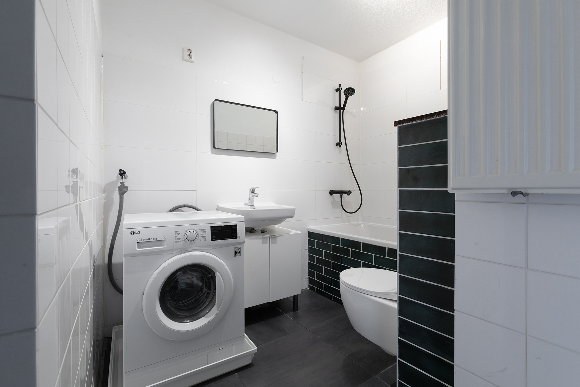 De moderne badkamer, bereikbaar vanuit de hal, heeft een ligbad met douche, wastafel en aansluiting voor de wasmachine en droger. Ook het toilet staat in deze ruime badkamer.
