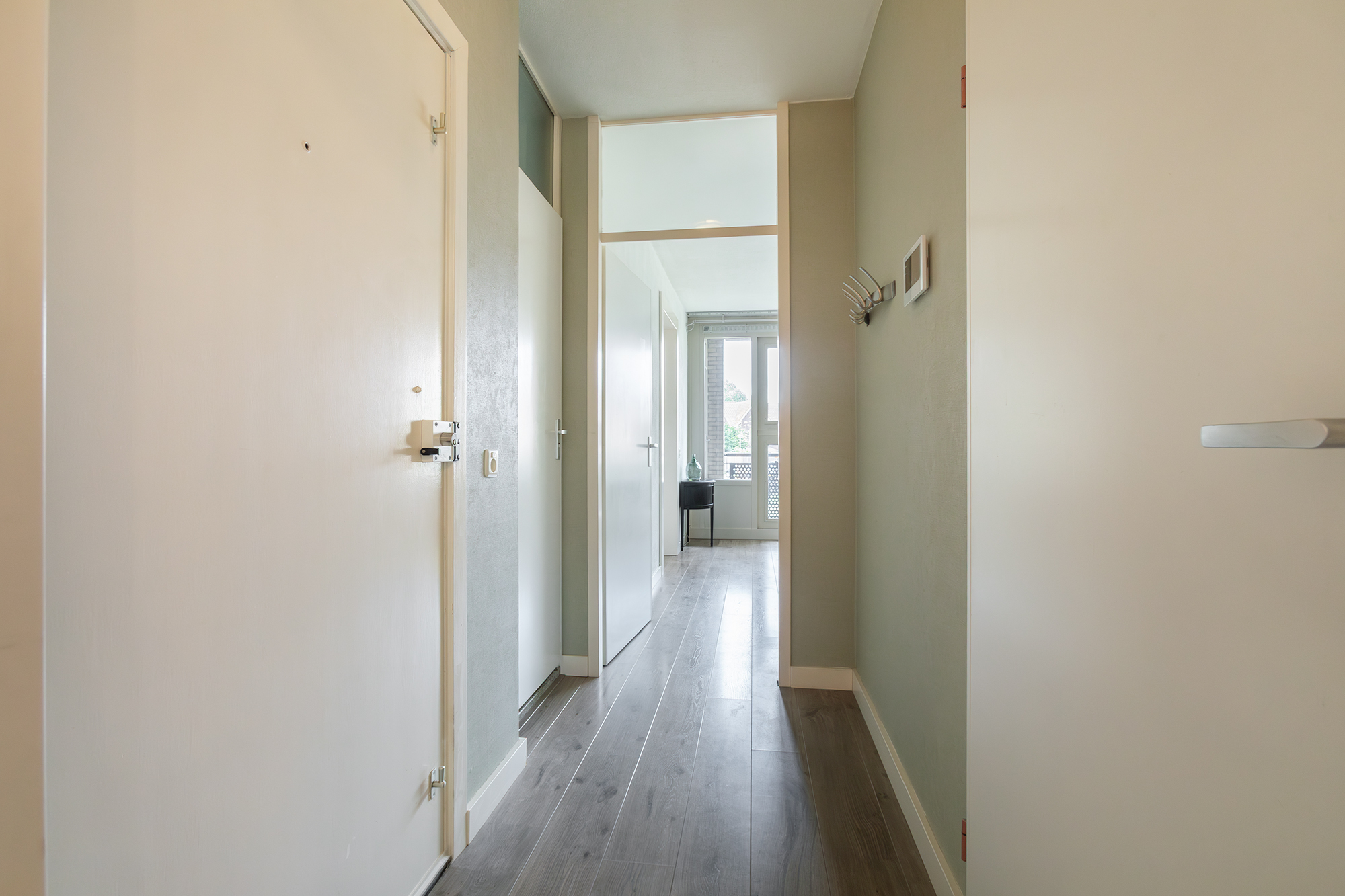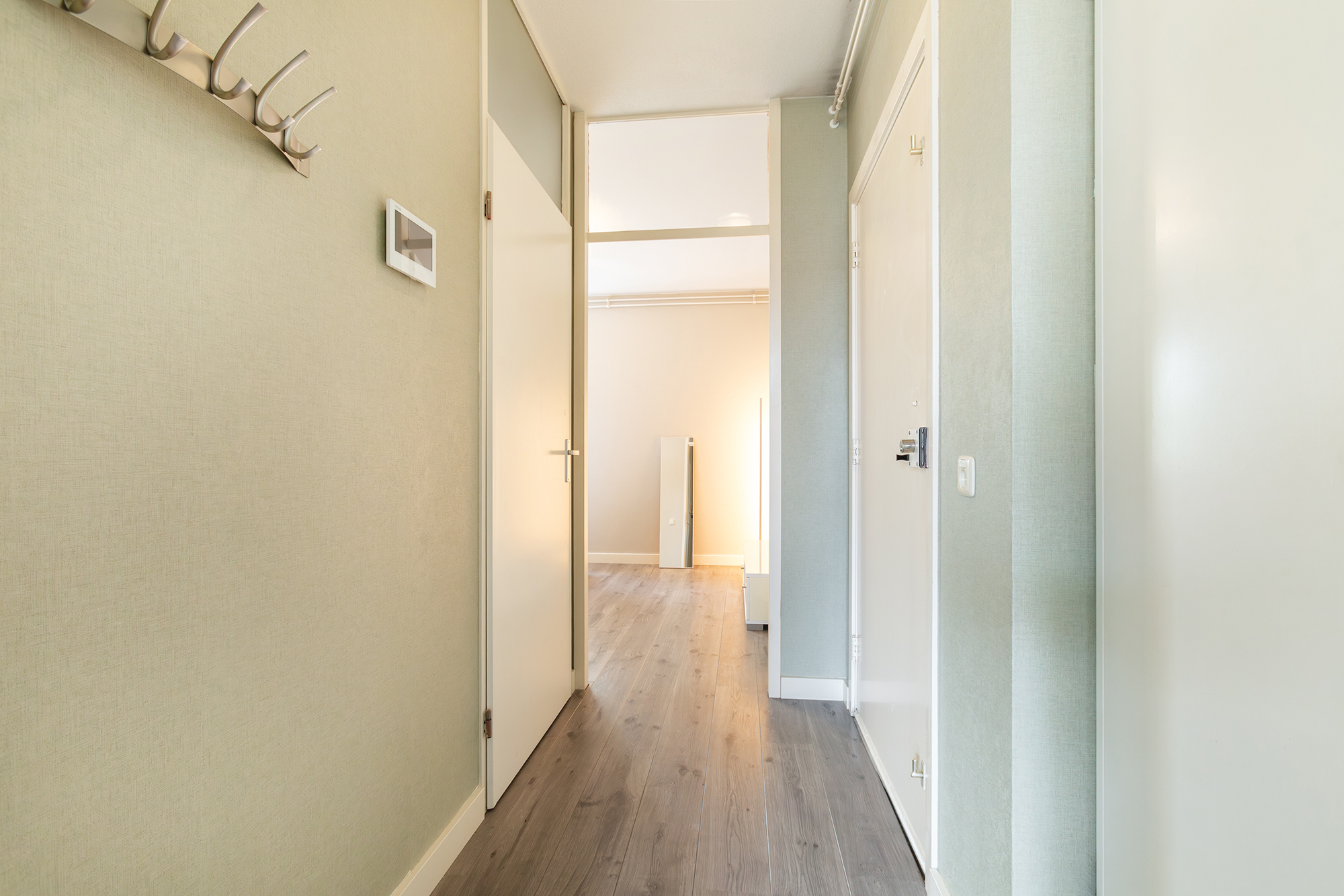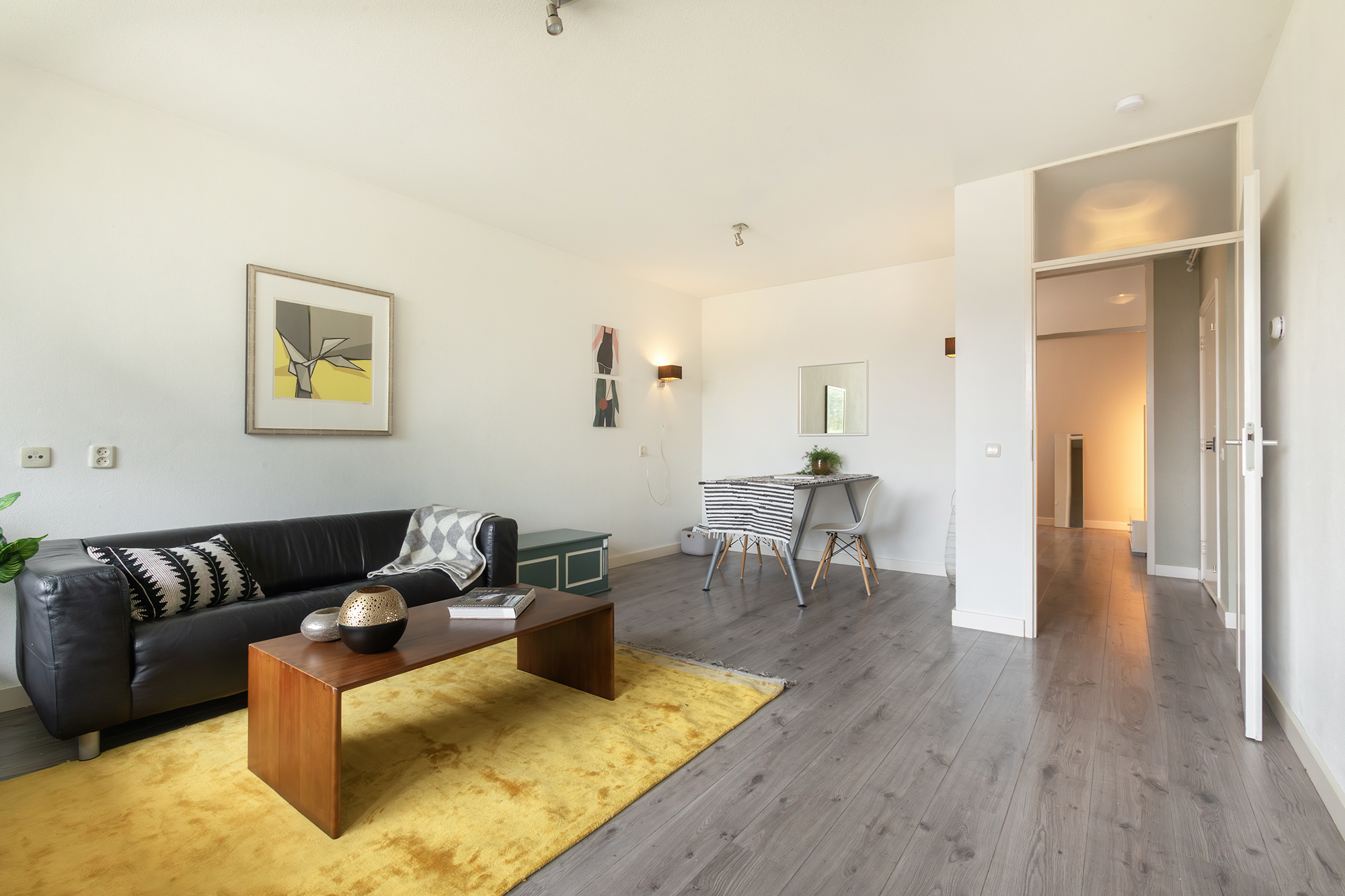 Via de gemeenschappelijke entree en trap bereik je de woning op de eerste verdieping. De hal geeft toegang tot de woonkamer, slaapkamer en badkamer. De lichte woonkamer heeft hoge plafonds en gesausde wanden, wat zorgt voor een ruimtelijk gevoel. Vanuit de woonkamer bereik je de moderne open keuken met diverse inbouwapparatuur. Er is genoeg ruimte voor een eettafel, waardoor je tijdens het bakken en koken gezellig met elkaar kunt praten.