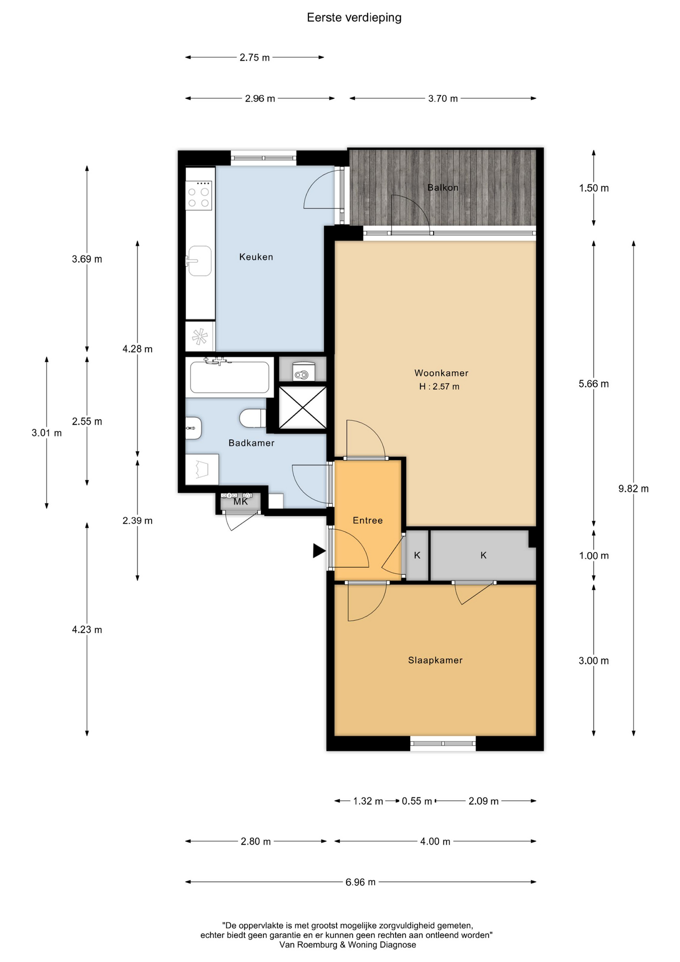 De woonoppervlakte bedraagt 57 m², exclusief het balkon en de berging. De woning is ingemeten volgens de richtlijnen van NEN2580, door een extern bureau. Het meetrapport is uiteraard beschikbaar.