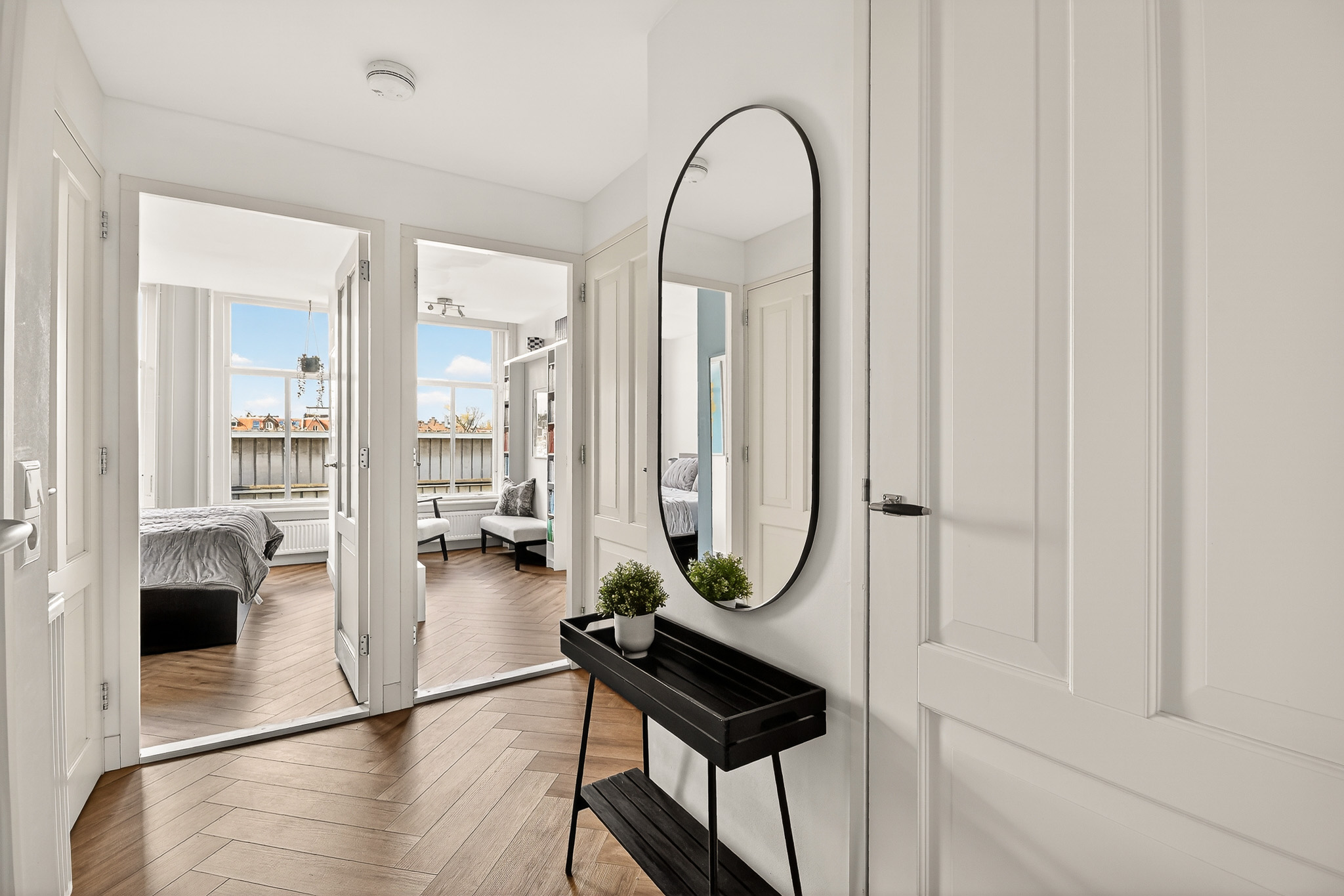 Aan de achterzijde liggen twee slaapkamers, beide met hoge ramen op het zuiden waardoor het hier heerlijk licht is. De hoofdslaapkamer is ruim, de tweede kamer perfect als werk-, logeer- of kinderkamer. De badkamer is modern uitgevoerd en beschikt over een ruime douche, wastafelmeubel en handdoekradiator. Het separate toilet bevindt zich tegenover de badkamer.