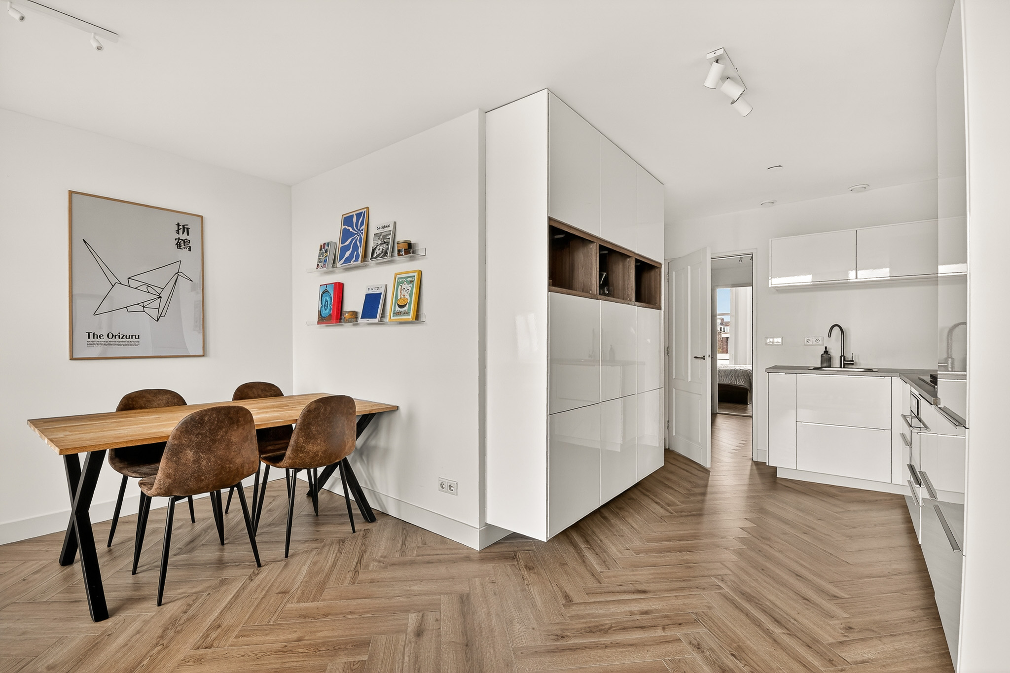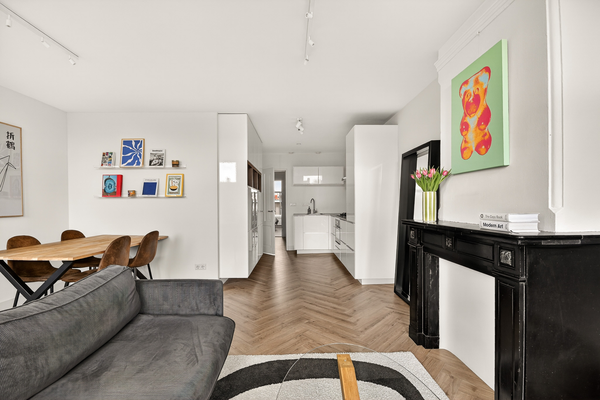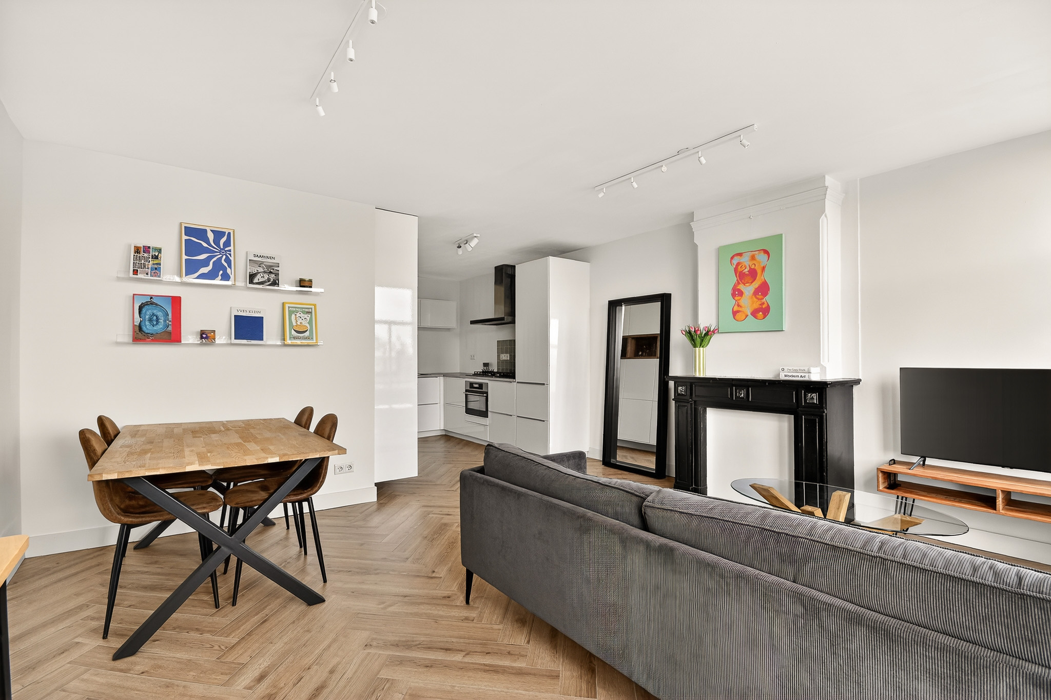 The living room is spacious and well laid out, with beautiful natural light coming through three large windows at the front. Smooth plastered walls and a fresh finish create a calm and modern feel. The open corner kitchen is sleek and functional, fitted with built-in appliances and a stylish worktop. Cleverly designed with ample storage for all your kitchen essentials.