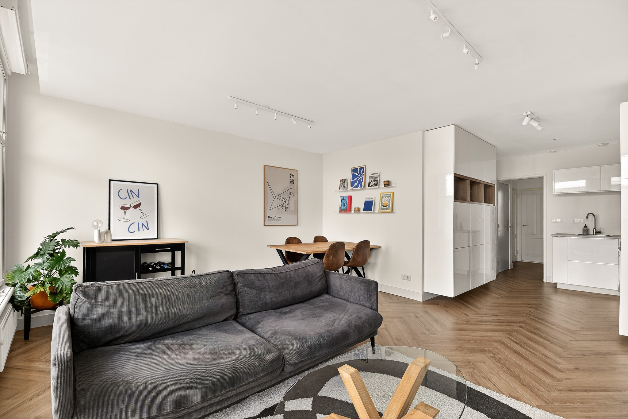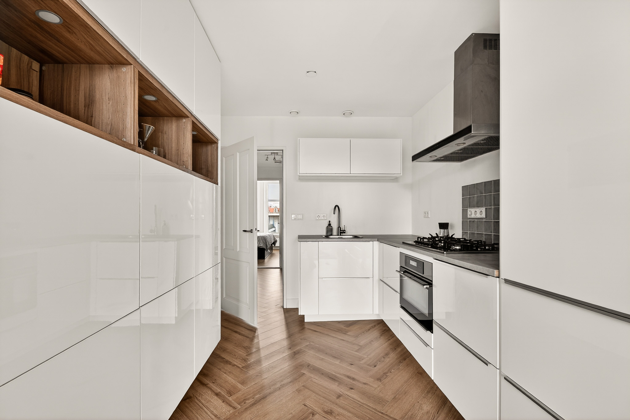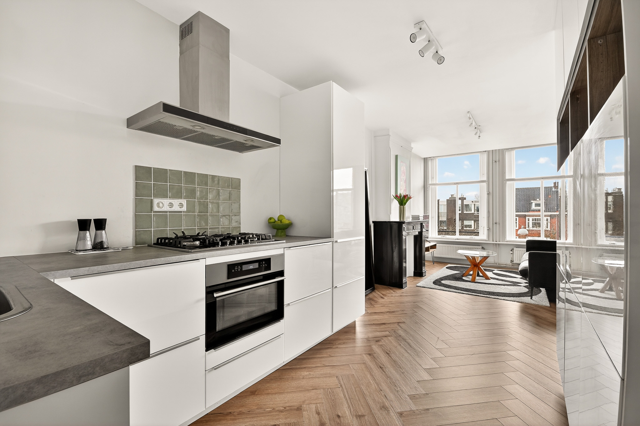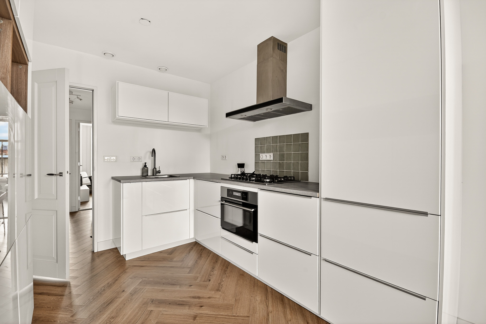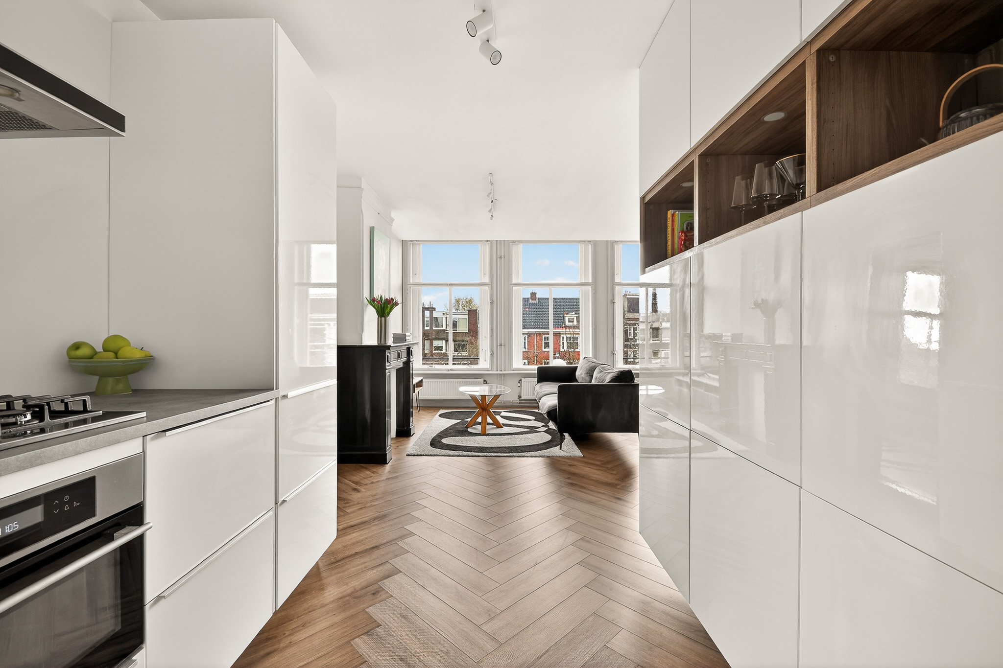 De woonkamer is ruim opgezet en prettig ingedeeld, met een mooie lichtinval dankzij de drie grote ramen aan de voorzijde. De gestuukte wanden en frisse afwerking zorgen voor een rustige basis. De open hoekkeuken is modern en praktisch ingericht, voorzien van inbouwapparatuur en een fraai werkblad. Alles is doordacht ingedeeld, met voldoende bergruimte voor al je kookbenodigdheden.