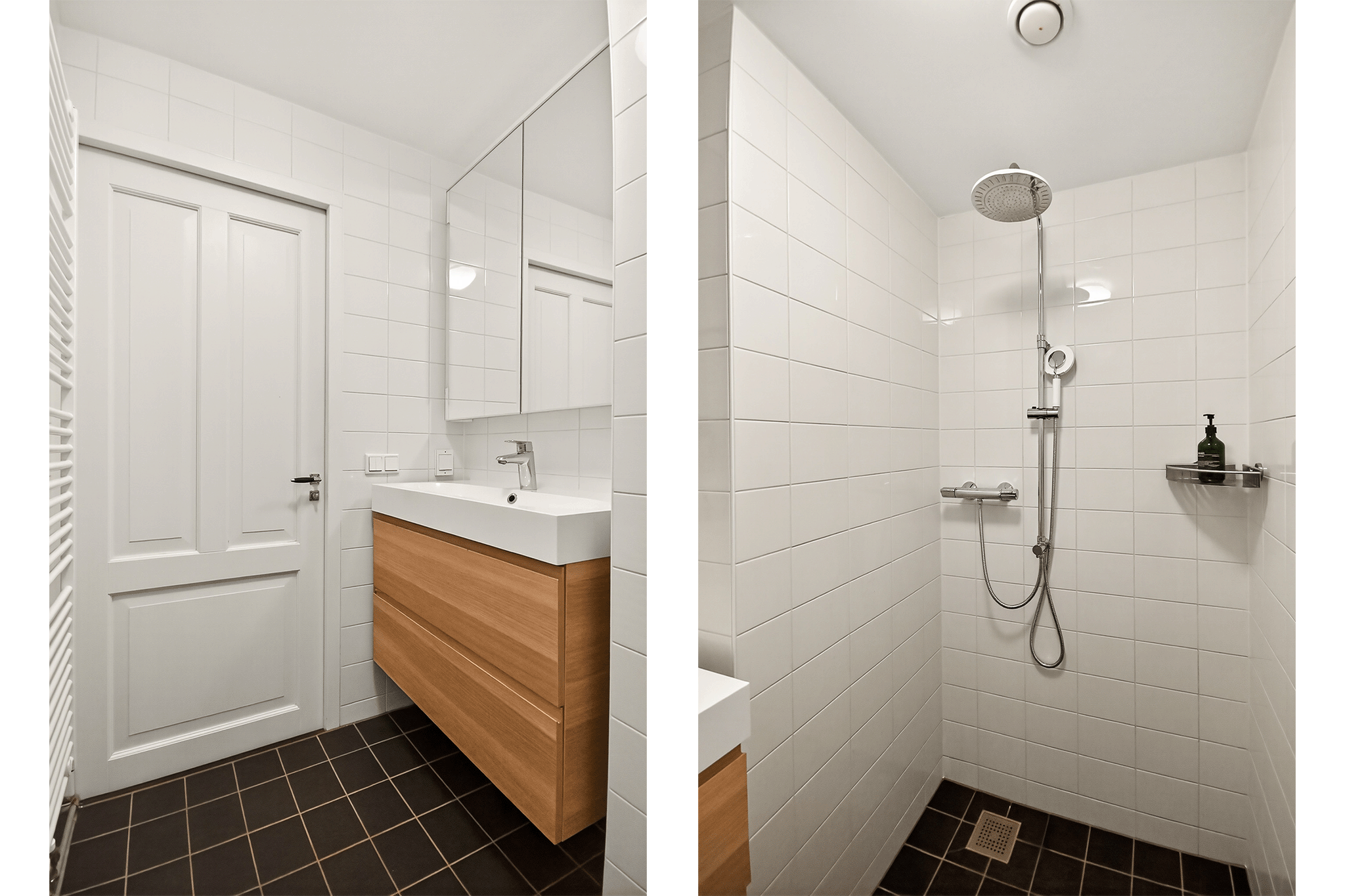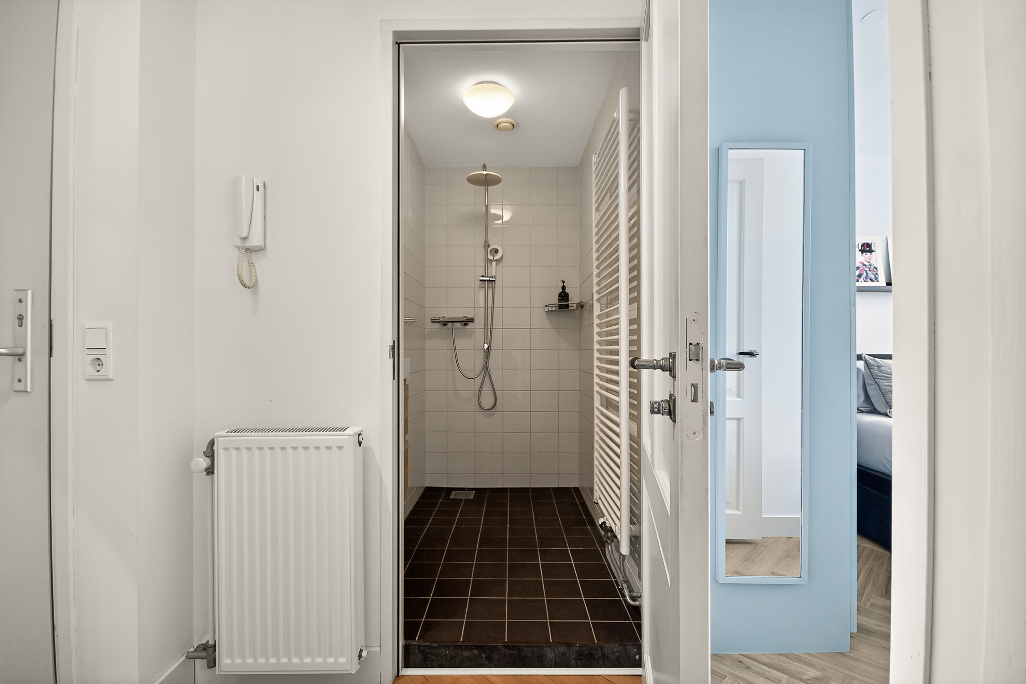At the rear of the apartment are two bedrooms, both featuring large south-facing windows that allow for plenty of natural light. The main bedroom is generously sized, while the second room is ideal as a home office, guest room or child’s bedroom. The bathroom is modern and includes a spacious shower, vanity unit and towel radiator. A separate toilet is located opposite the bathroom.