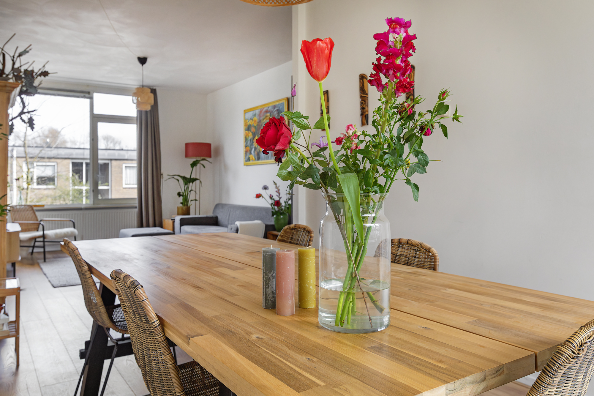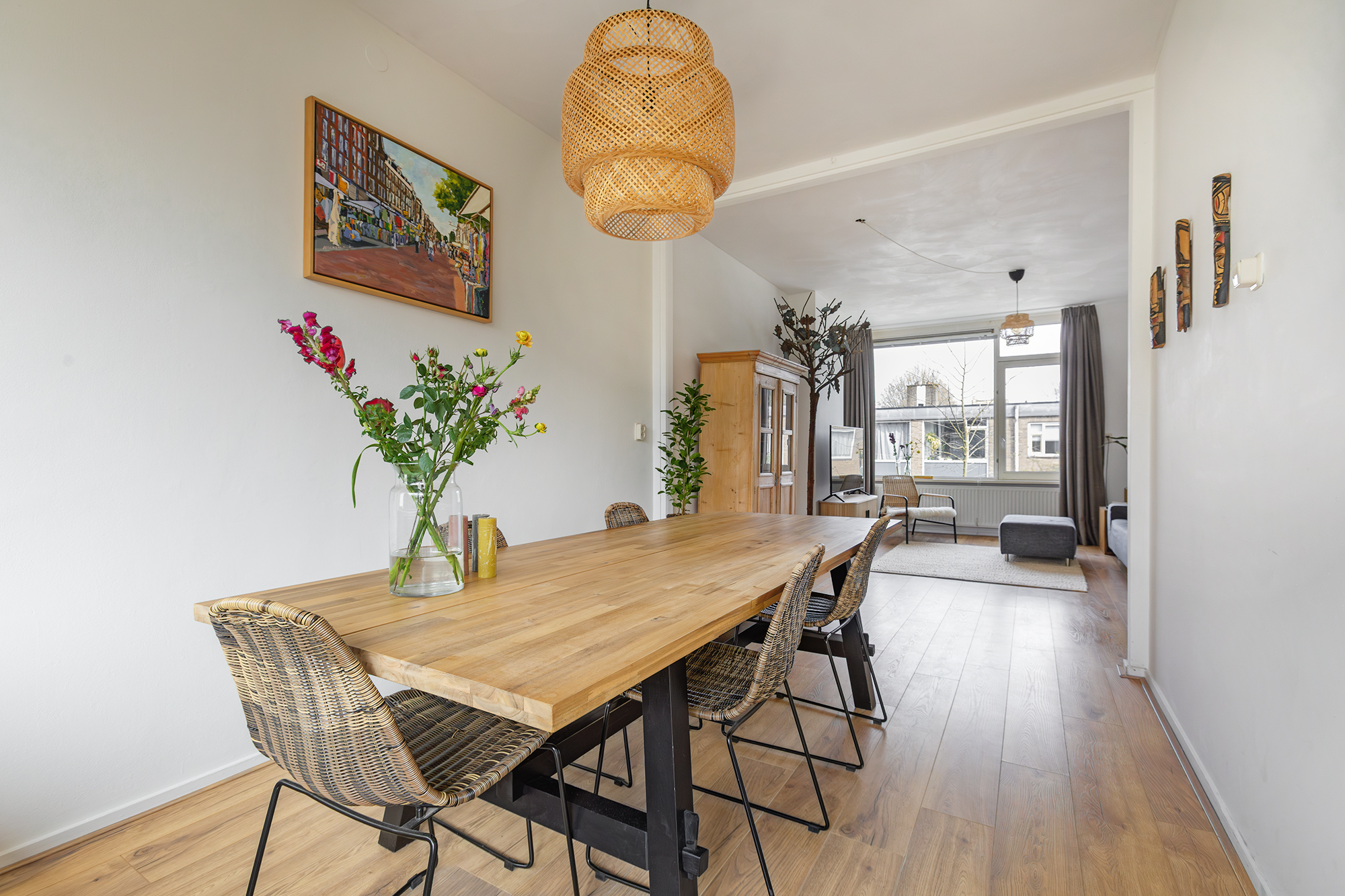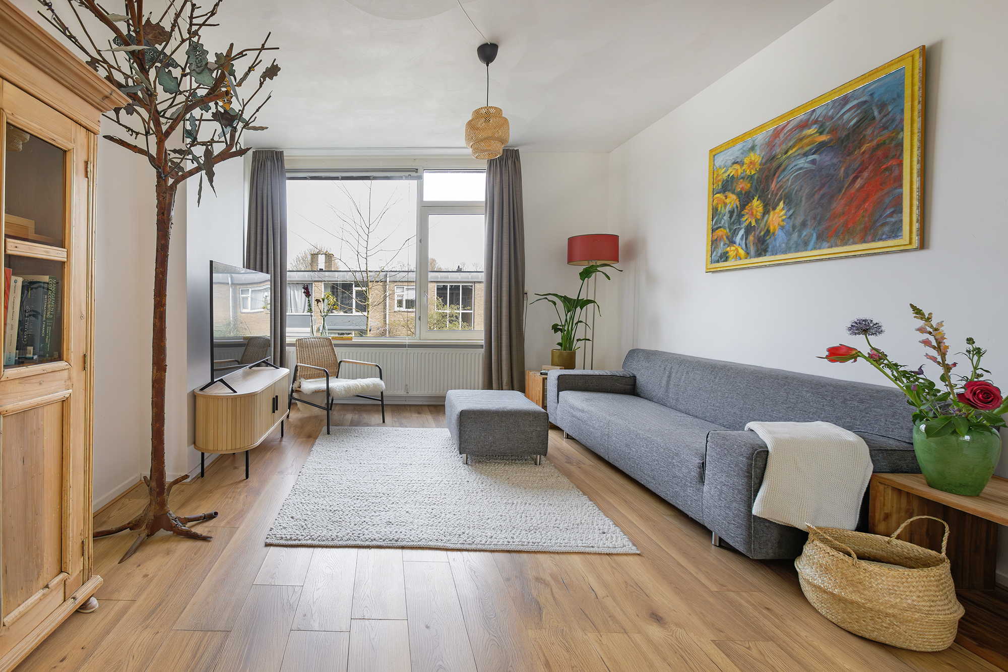 De woonkamer is heerlijk licht en strekt zich uit van de voor- tot de achterzijde van de woning. Dankzij de grote raampartijen aan beide kanten voelt de ruimte open en ruim aan. Er is voldoende plek voor een comfortabele zithoek en een ruime eettafel.