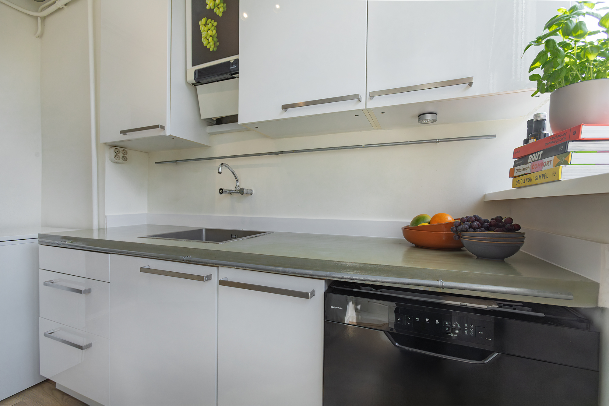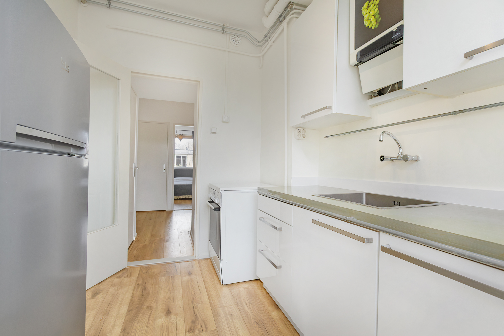 De keuken bevindt zich aan de achterzijde en is bereikbaar via de hal. De keuken is eenvoudig maar functioneel, uitgevoerd met witte kastjes en een lichtgroen werkblad. Je kookt hier op gas en hebt direct toegang tot het balkon via de keukendeur. Vanuit de keuken loop je door naar de badkamer.