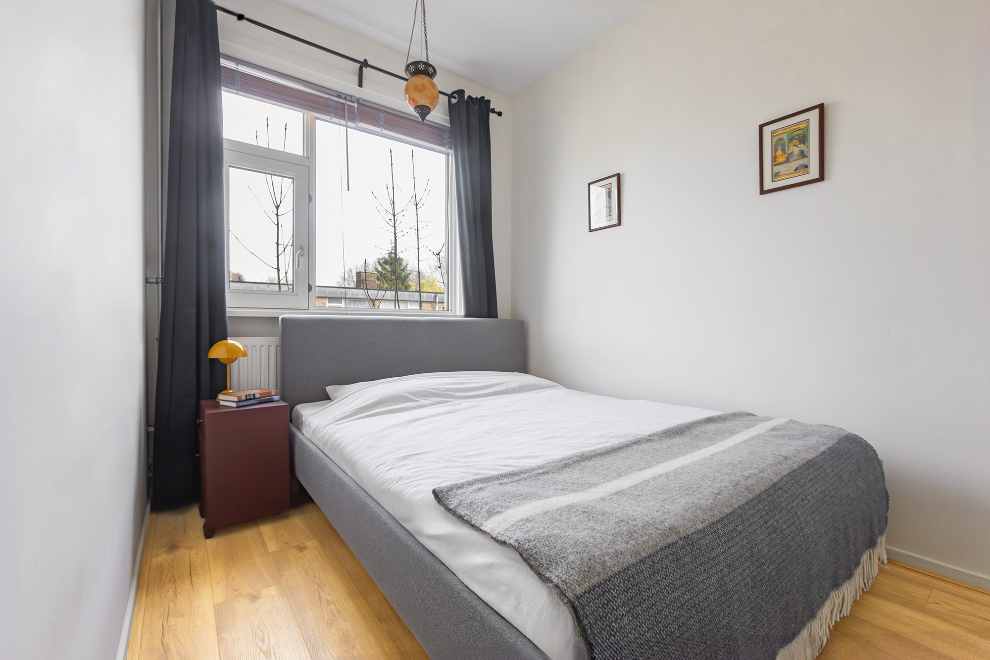 De slaapkamer ligt aan de voorzijde van de woning en is groot genoeg voor een tweepersoonsbed van 1,80 meter. Zowel in de slaapkamer als in de hal zijn handige inbouwkasten aanwezig, ideaal voor kleding en extra bergruimte.