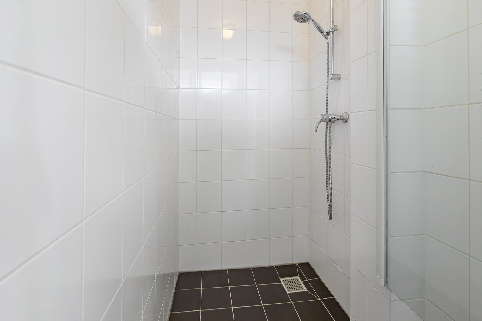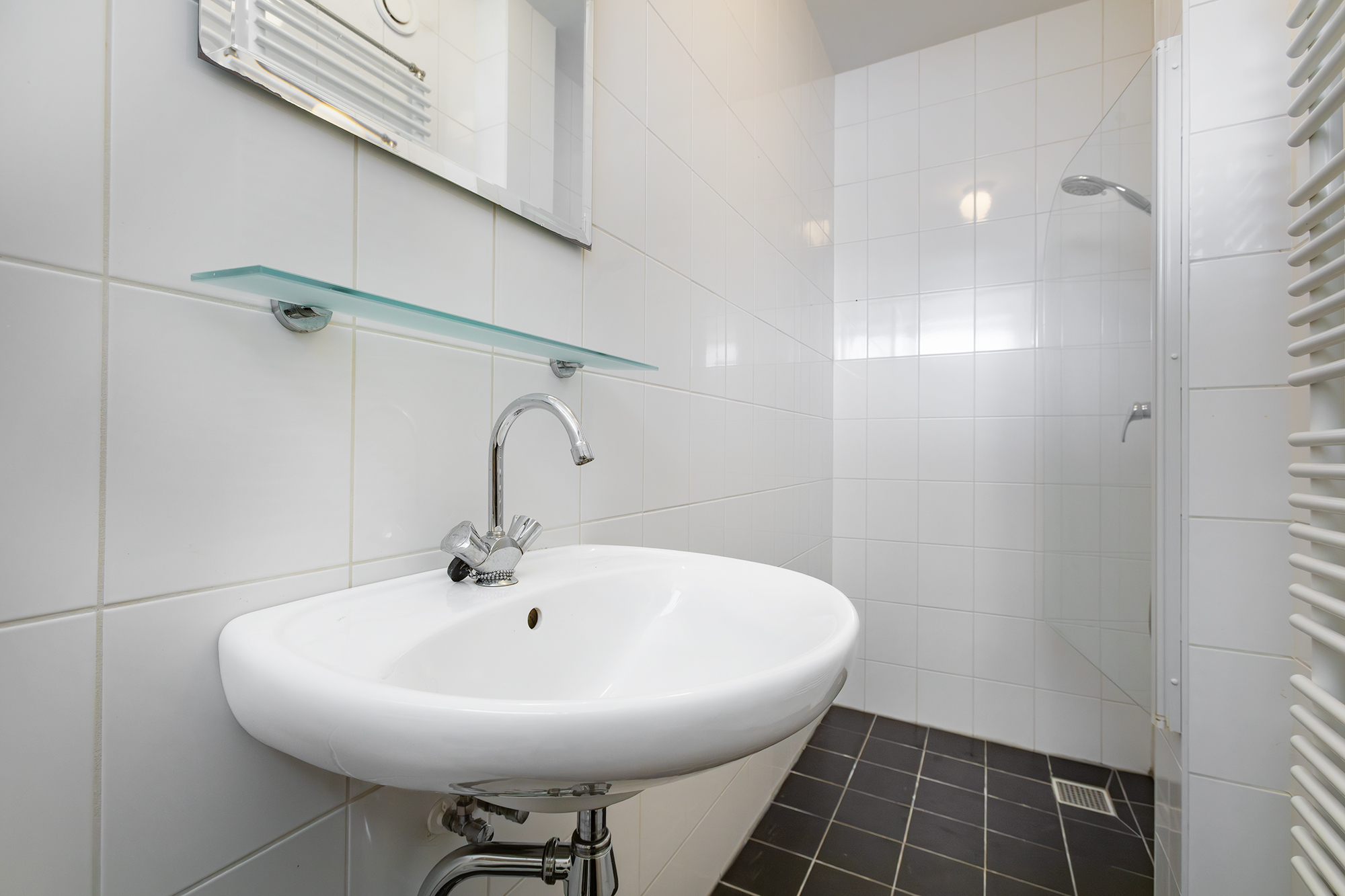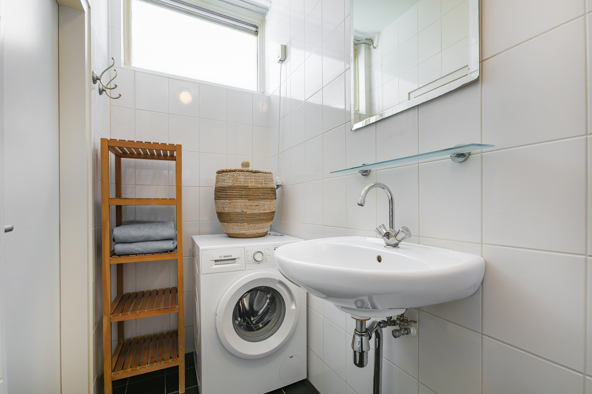De badkamer is bereikbaar via de keuken en is praktisch ingericht met witte tegels, een douche en een wastafel. Daarnaast is er ruimte voor de wasmachine en beschikt de badkamer over een handdoekradiator.