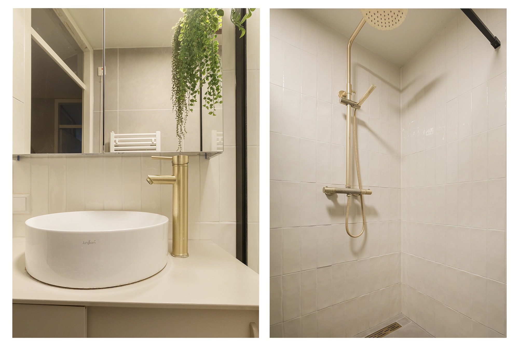 The three bedrooms vary in size and are perfect for use as sleeping and/or working spaces. The bathroom has a practical layout with a walk-in shower and modern washbasin unit. The toilet is separate and executed in the same color scheme.