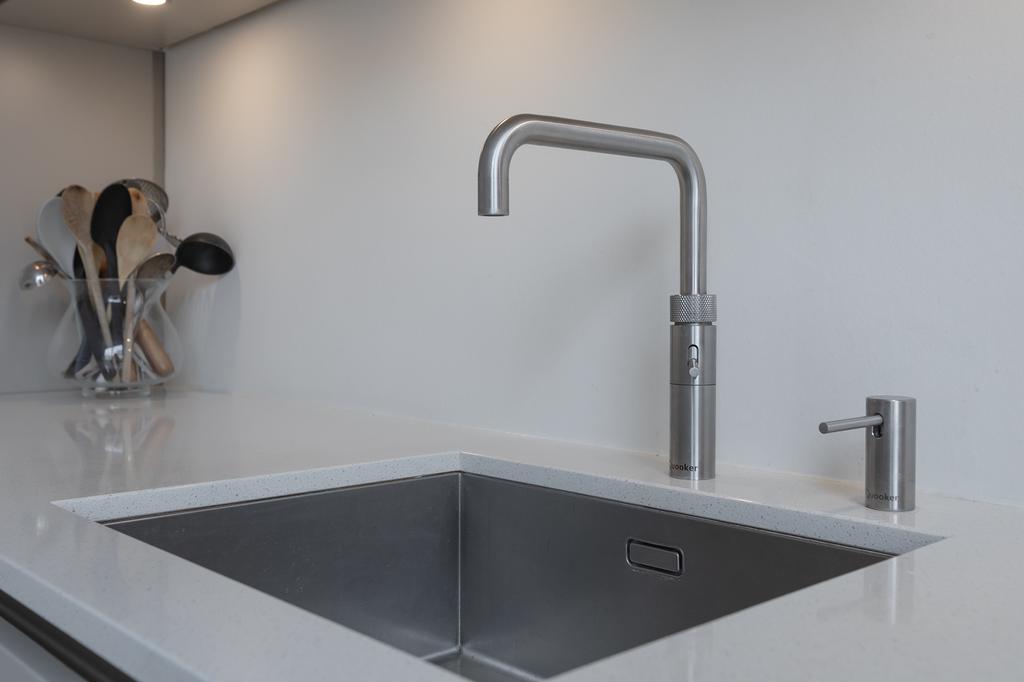 De luxe keuken met kookeiland is voorzien van alle gemakken. Denk aan een ingebouwde oven, aparte combimagnetron, een Quooker en volop opbergruimte. Hier is koken niet alleen functioneel, maar ook een plezier. De eethoek bij het kookeiland maakt het dé plek om te genieten van lange diners met vrienden en familie.