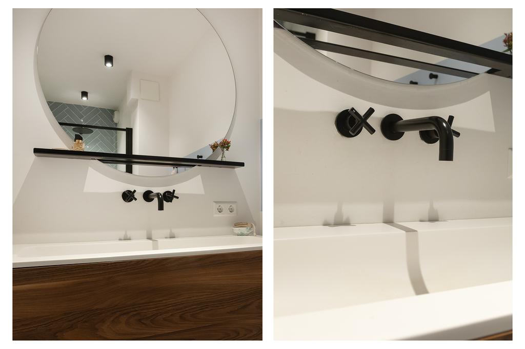 The apartment has two spacious bedrooms, one of which overlooks the inner garden and has access to the balcony. Both bedrooms are bright and roomy, perfect for a comfortable night’s sleep or a home office. The bathroom is modernly finished with a shower and washbasin, and the apartment has a separate toilet with a small sink.