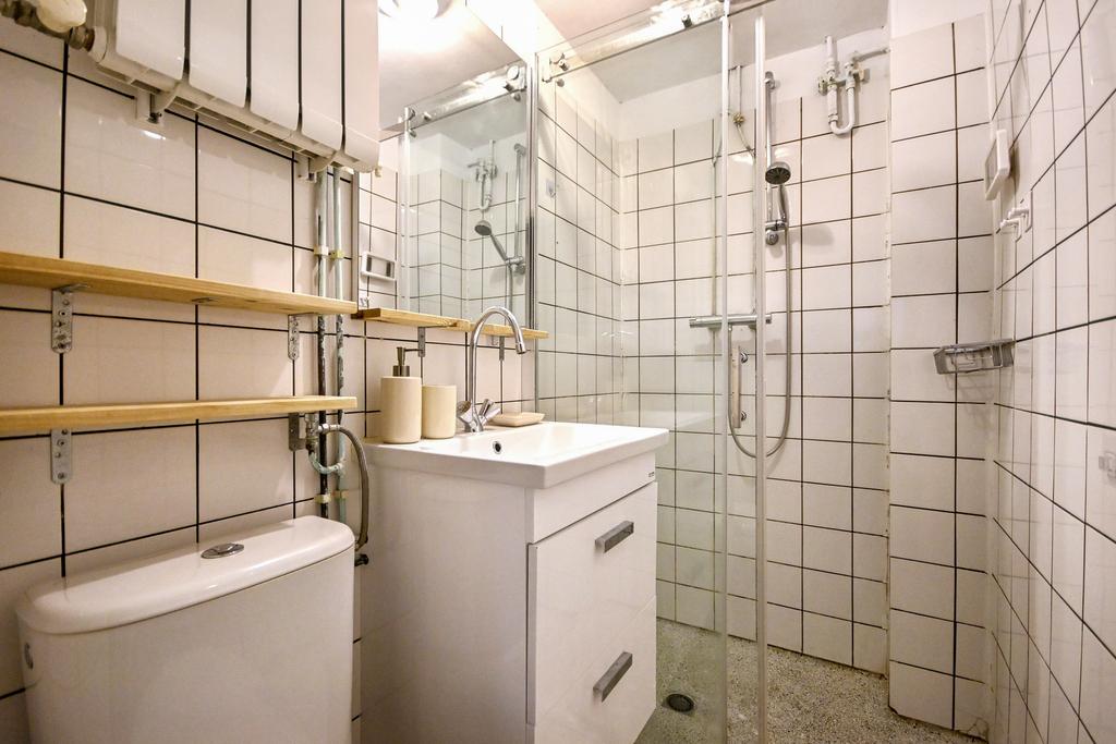 Currently, the apartment has one bedroom, but creating a second room is easily achievable. The bathroom is clean and equipped with a walk-in shower, sink vanity and toilet.