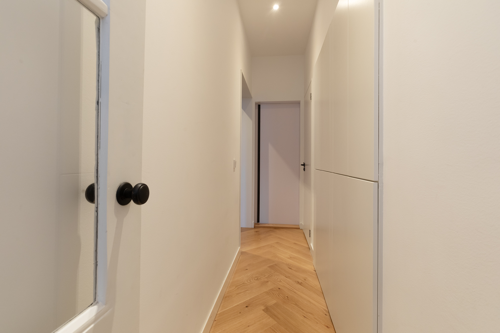 Upon entering via your own entrance, you enter the long hallway where the washing machine and dryer have also found a place through a beautiful custom-made wall.