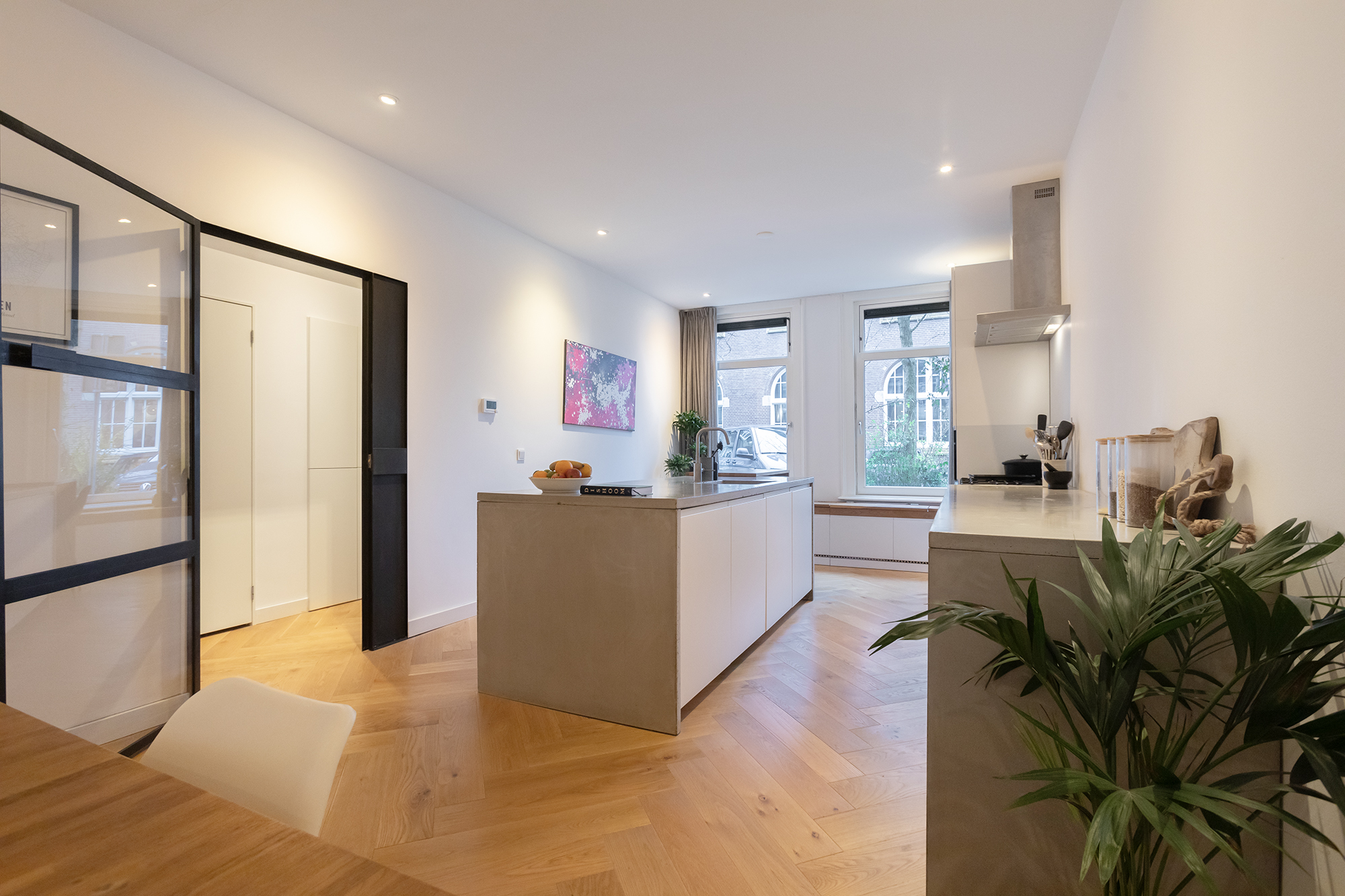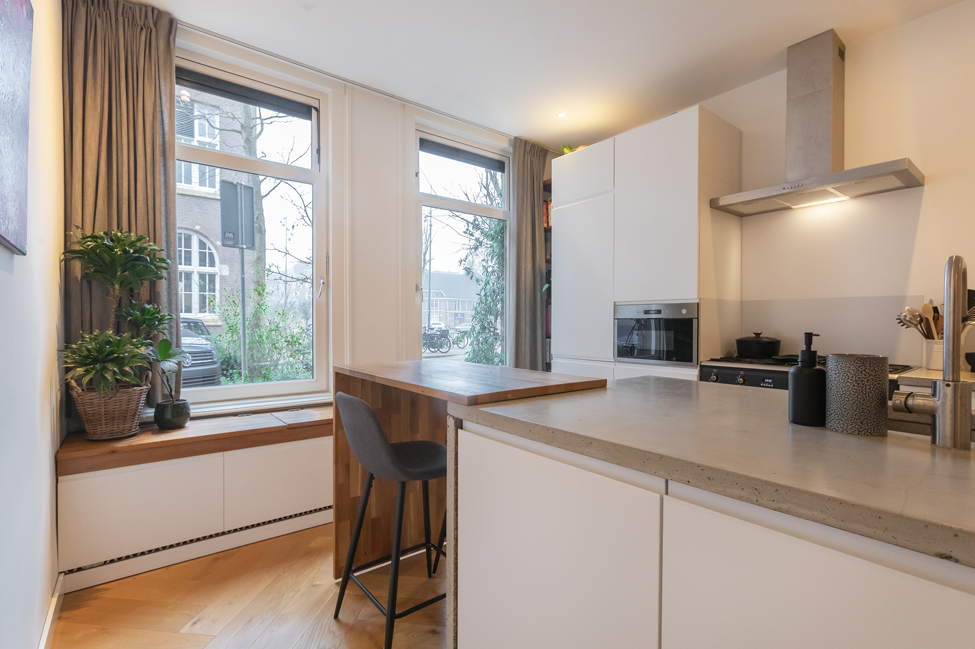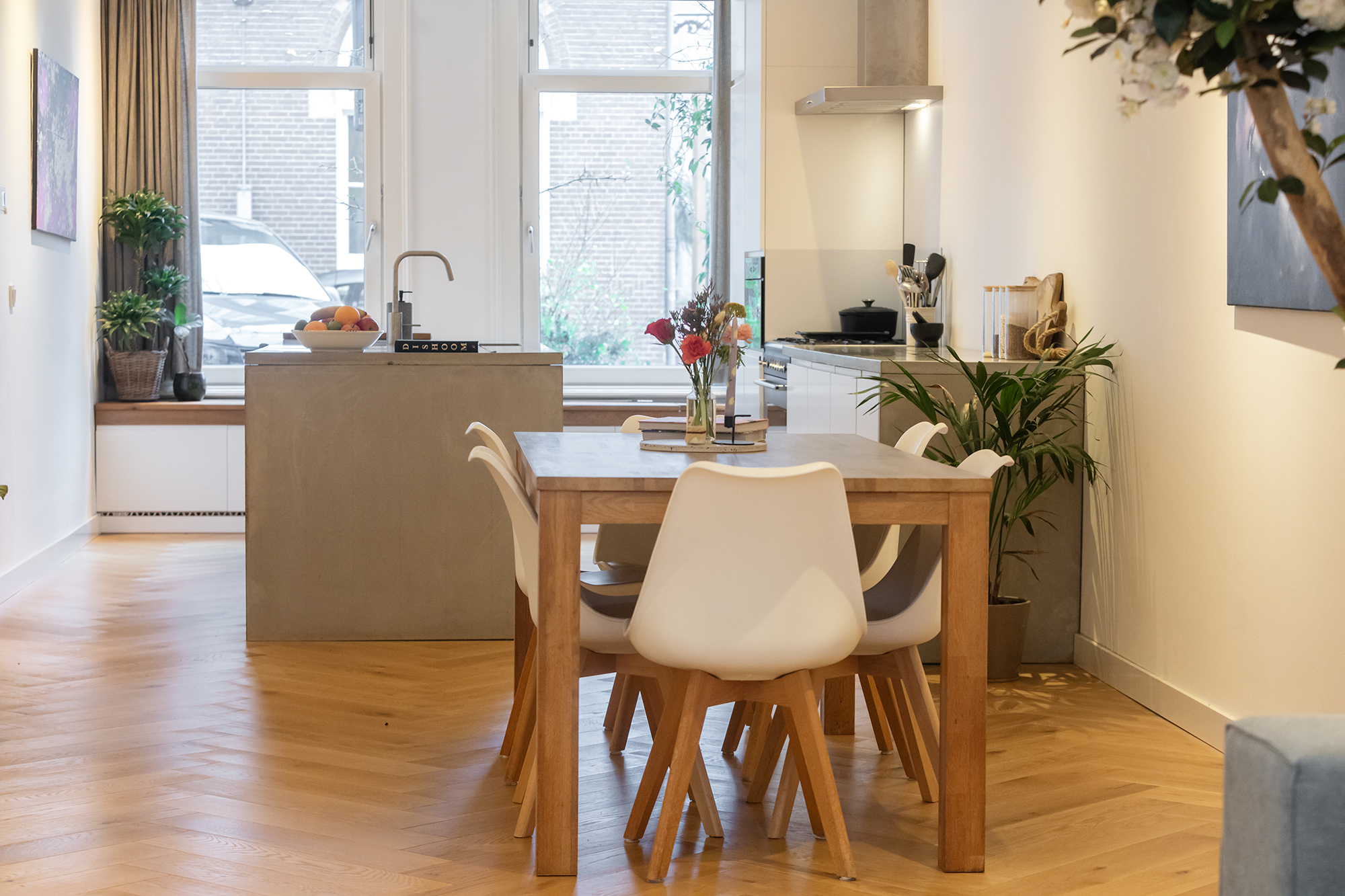 When you then walk into the living room, the beautiful kitchen island defines the atmosphere of the sleek yet super cosy kitchen. From here, there are views of Timorplein.