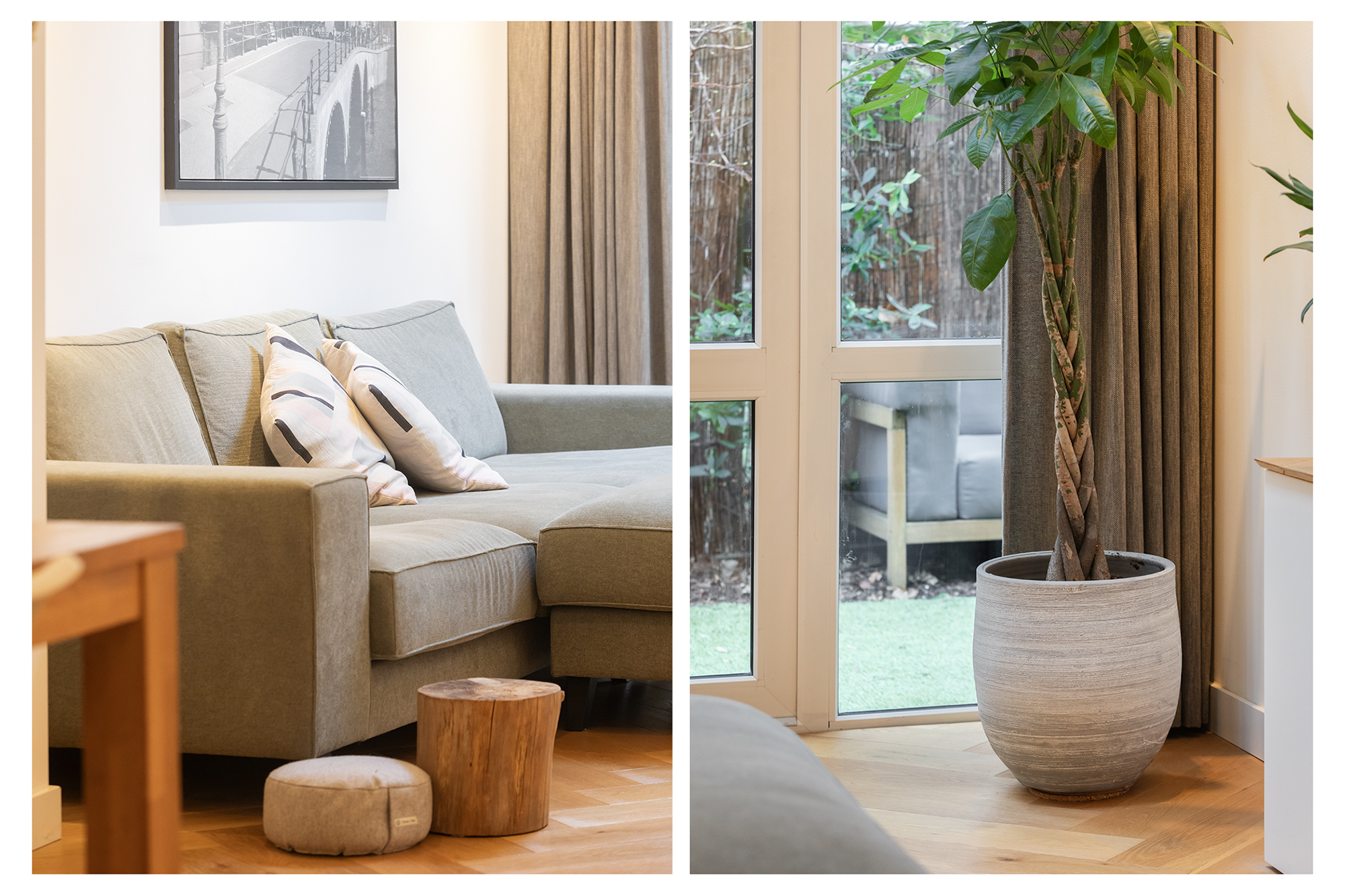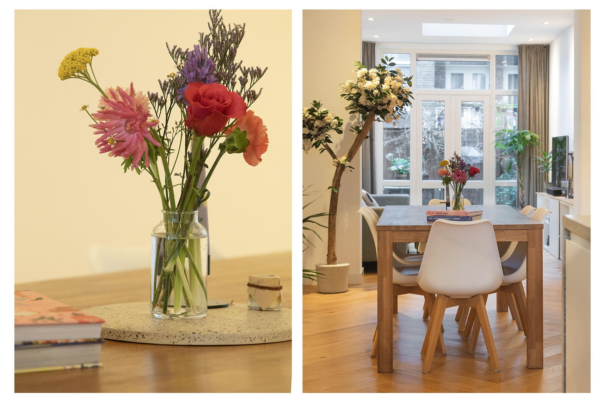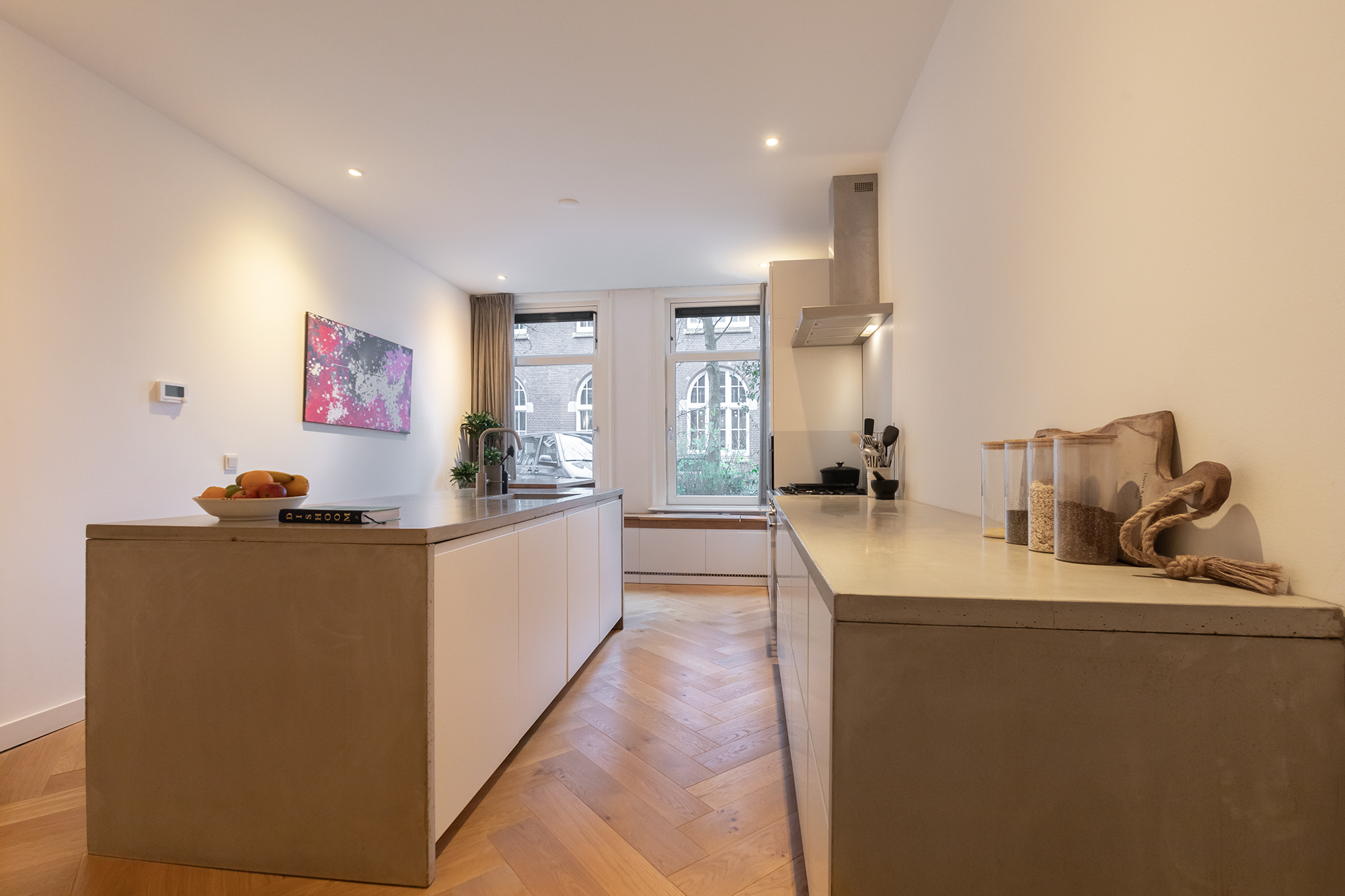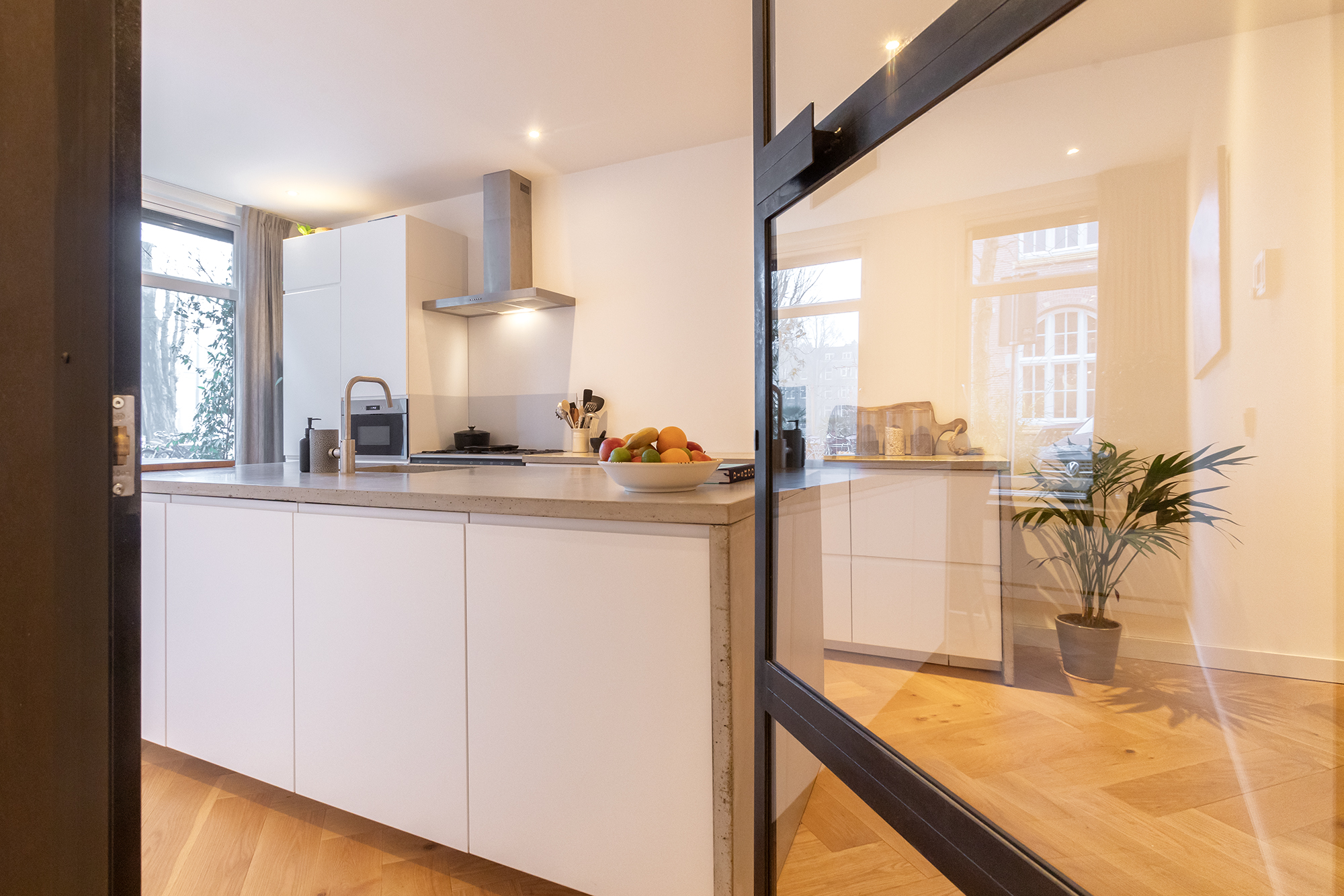 When you then walk into the living room, the beautiful kitchen island defines the atmosphere of the sleek yet super cosy kitchen. From here, there are views of Timorplein.