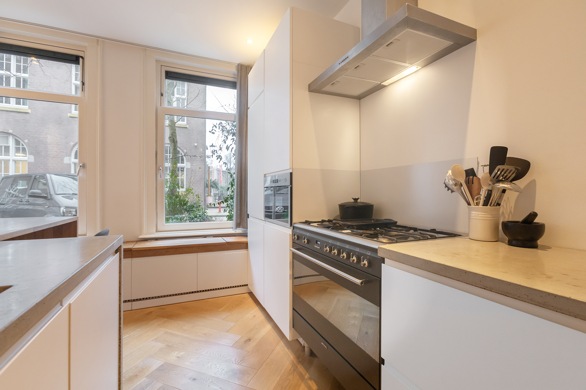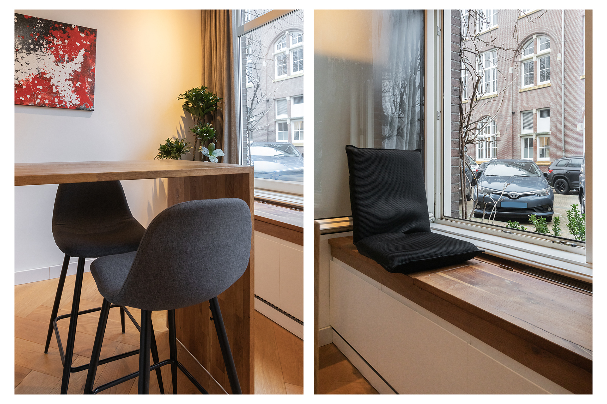 The open living-kitchen at the front of the house is a real eye-catcher. With plenty of work and storage space, this kitchen is ideal for cooking enthusiasts. Whether you are preparing a quick meal or organising an elaborate dinner with friends, the kitchen is fully equipped and offers a nice view over Timorplein from the wood-finished bar.