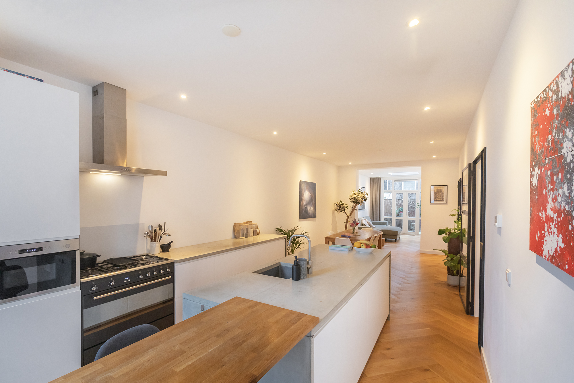 Als je vervolgens de living binnen loopt bepaalt het mooie keukeneiland de sfeer van de strakke maar toch super gezellige keuken. Van hieruit is er uitzicht op het Timorplein.