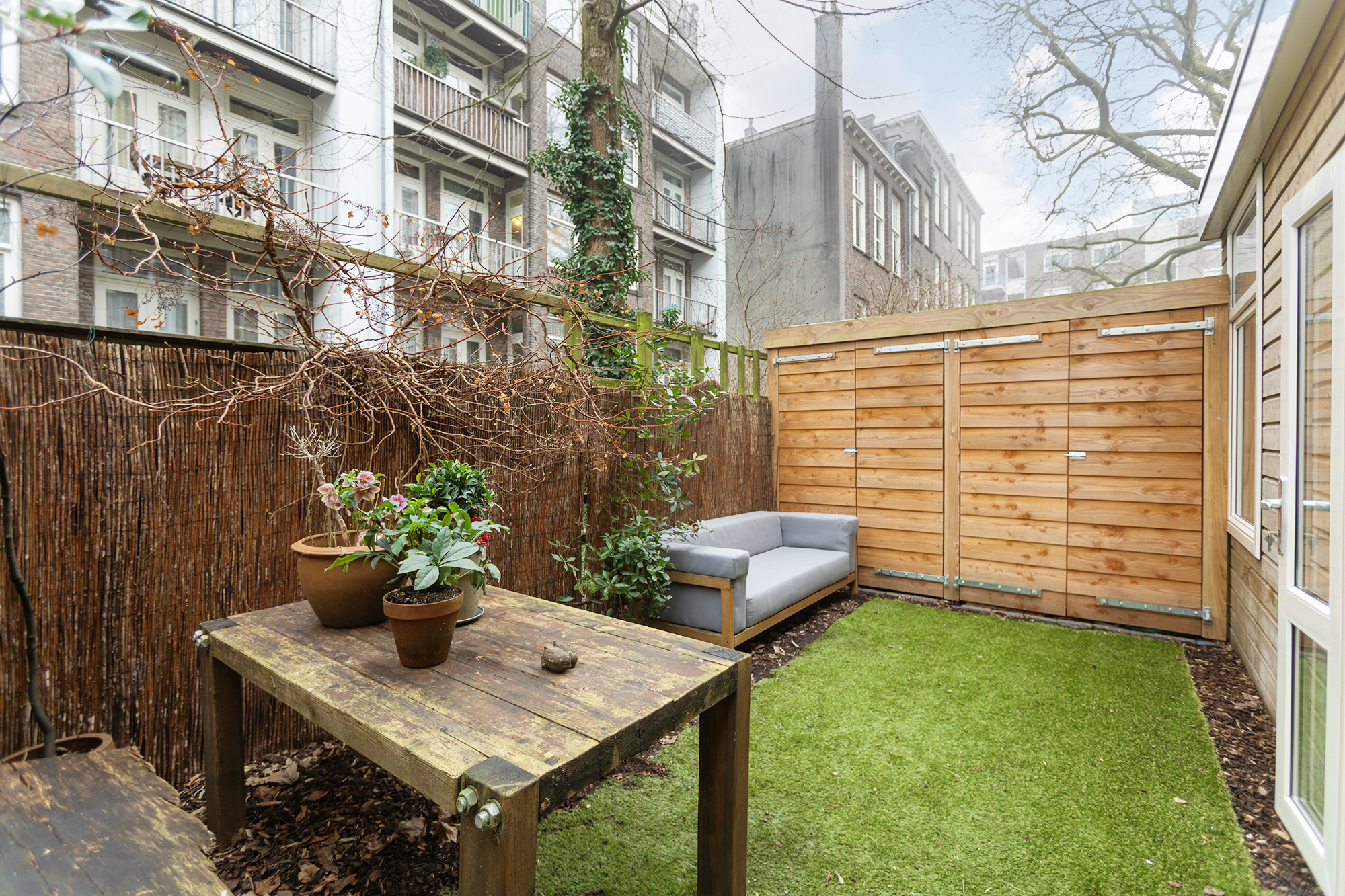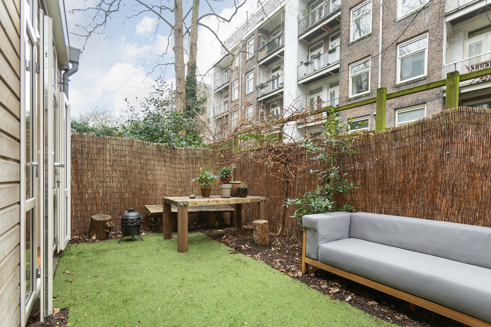 De fijne tuin aan de achterzijde is direct bereikbaar vanuit de woonkamer en biedt een rustige plek om te ontspannen midden in de stad. Met voldoende ruimte voor een lounge set en planten, is dit de perfecte plek om te genieten van het buitenleven. De tuin is een oase van rust in de levendige Indische Buurt. Er is een aparte berging voor het stallen van tuinkussens, tuingereedschap en een wielrennersfiets.