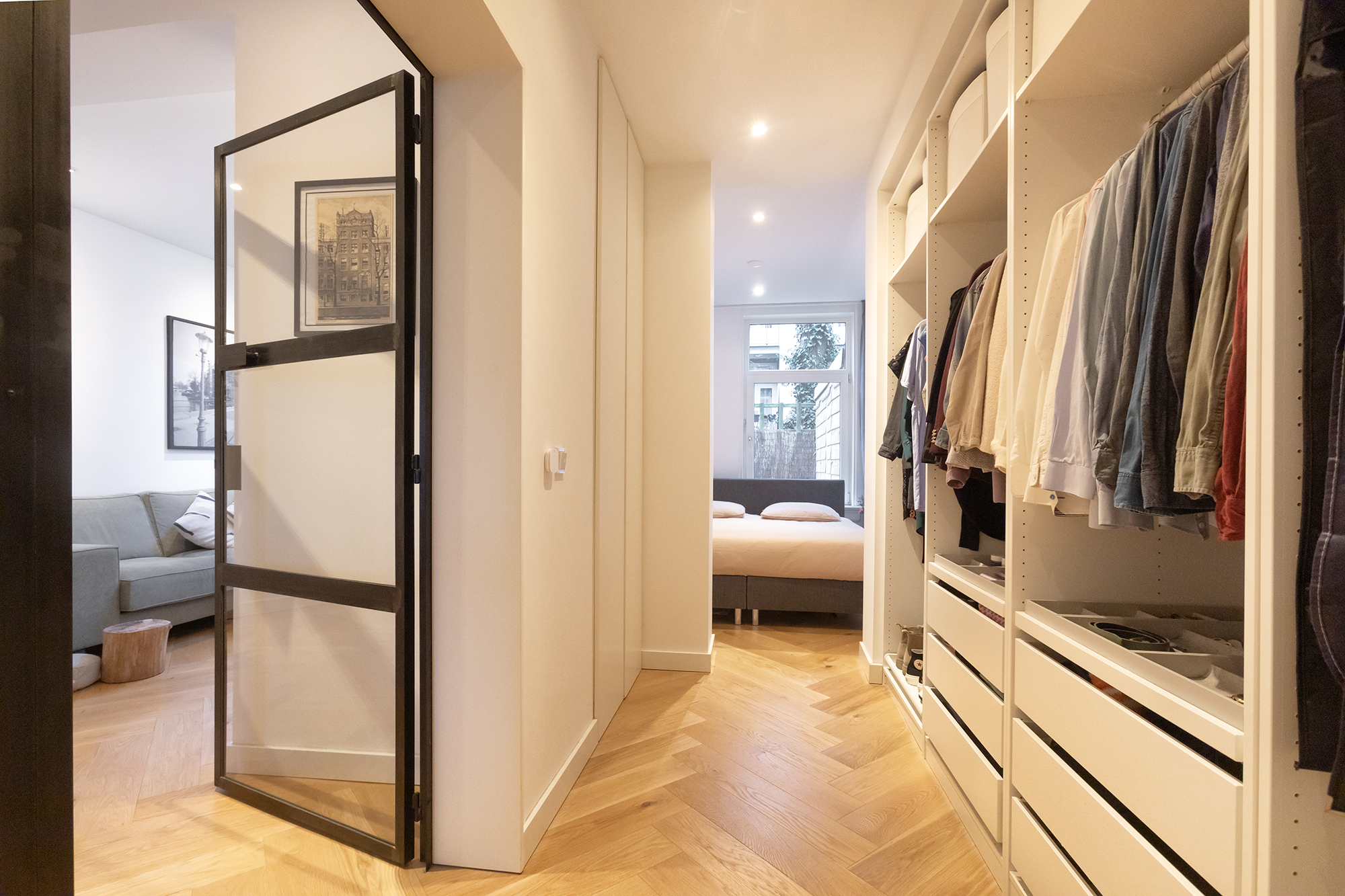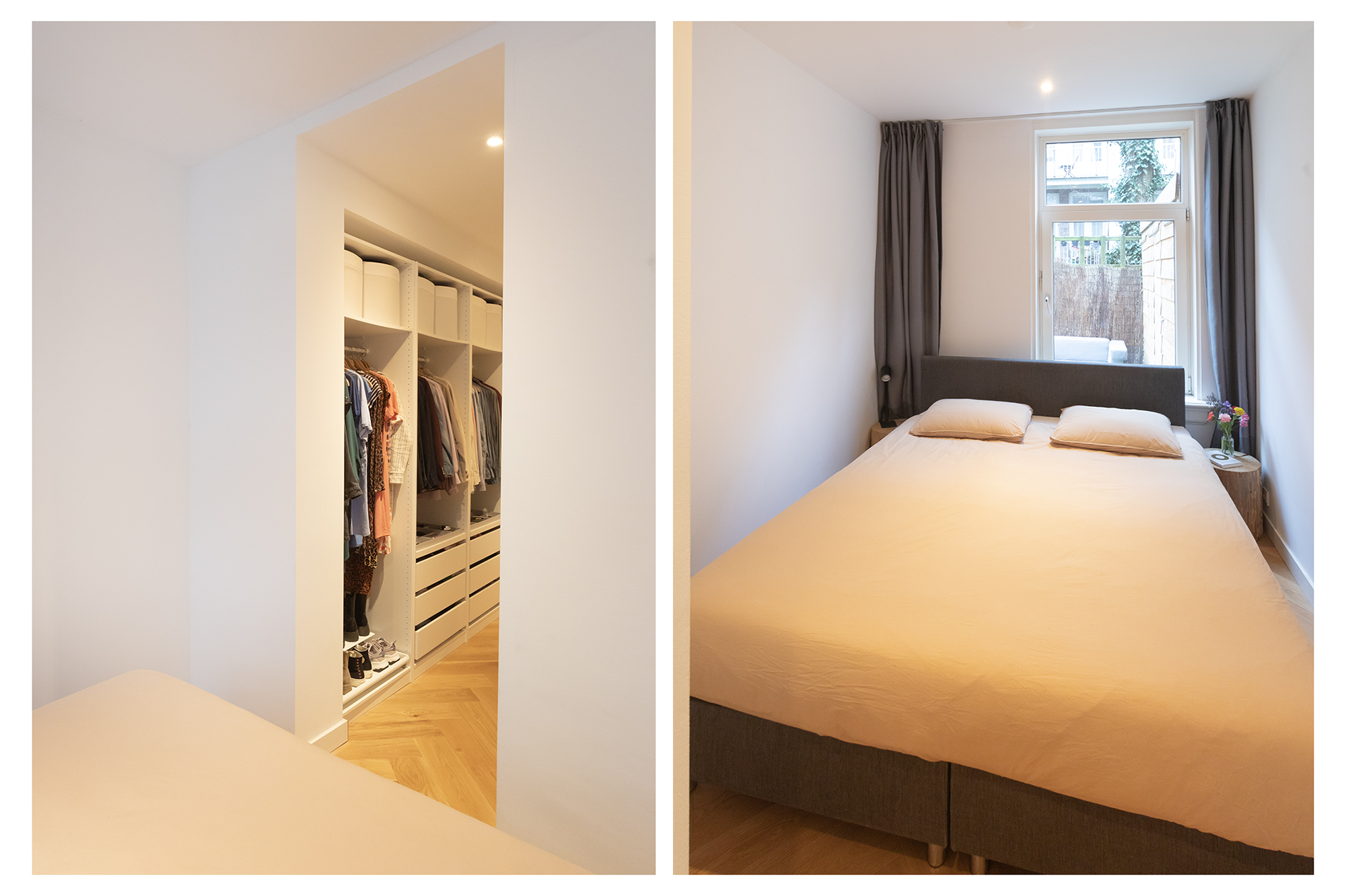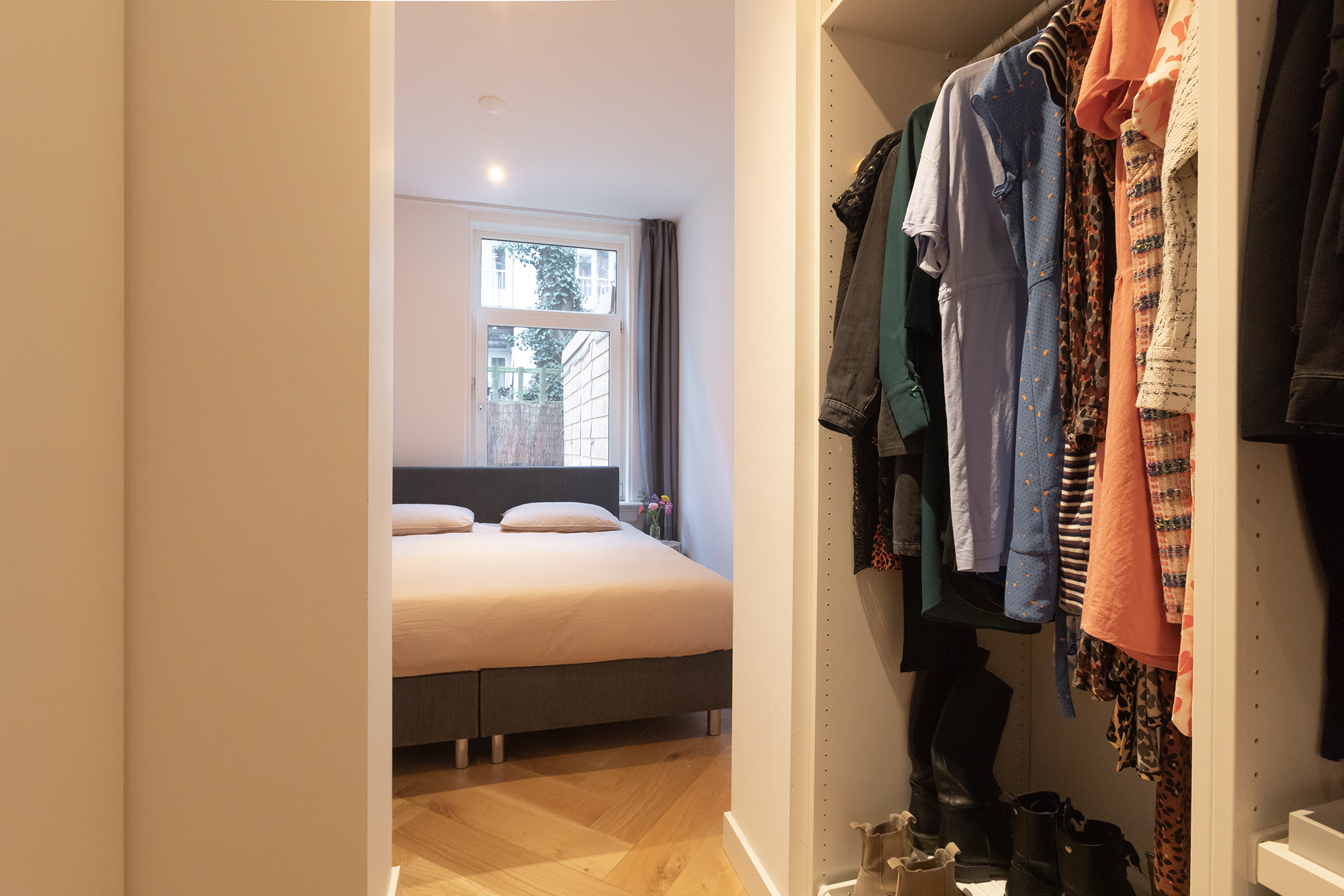Ook de slaapkamer ligt aan de rustige achterzijde en loop je binnen via de inloopkasten waar je je kleding op kunt bergen.
