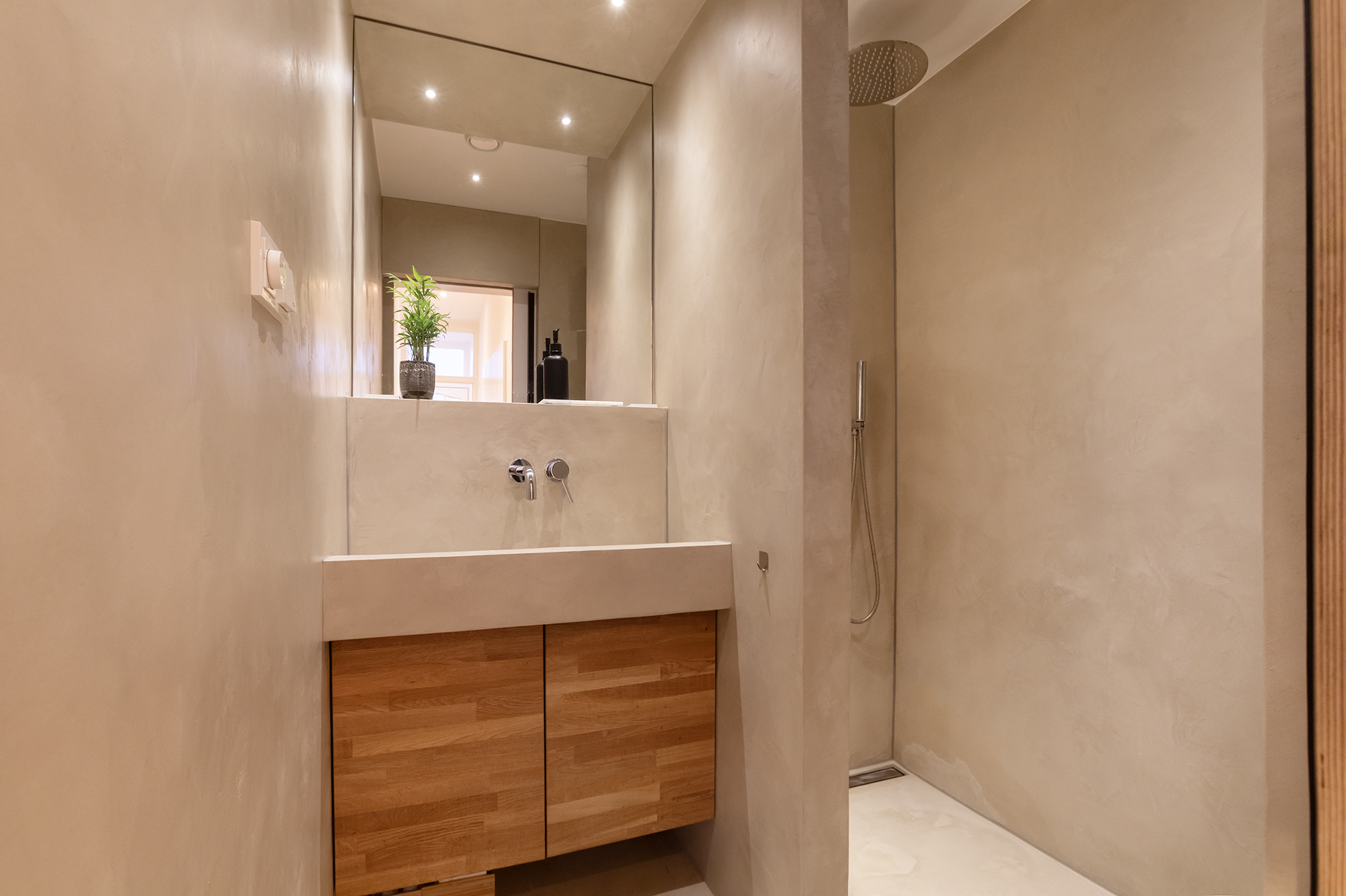 De strakke, op maat gemaakte, moderne badkamer is voorzien van een fraai wastafelmeubel en een inloop-regendouche. Het toilet is apart en in dezelfde stijl uitgevoerd.