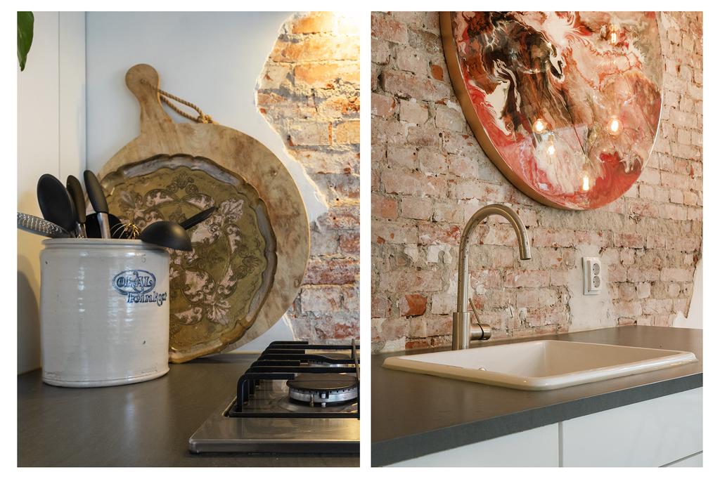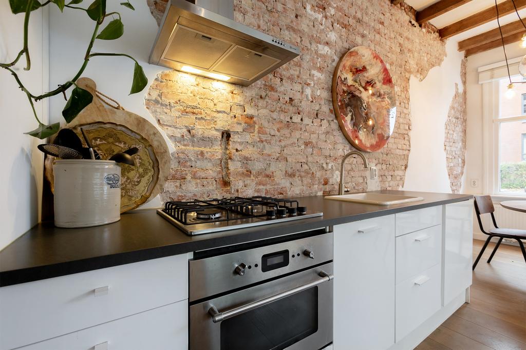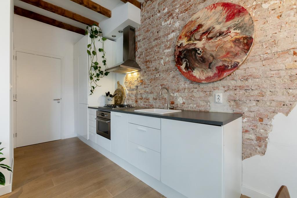 Dit appartement heeft niet alleen een modern uiterlijk, maar ook een rijke historie. Het pand was oorspronkelijk een winkelpandje en heeft een charmant detail: achter een witte stucplaat op de stenen muur zit een oude deur verborgen. Deze deur gaf vroeger toegang tot de voormalige woonruimte, een unieke herinnering aan de oorspronkelijke functie van het gebouw.