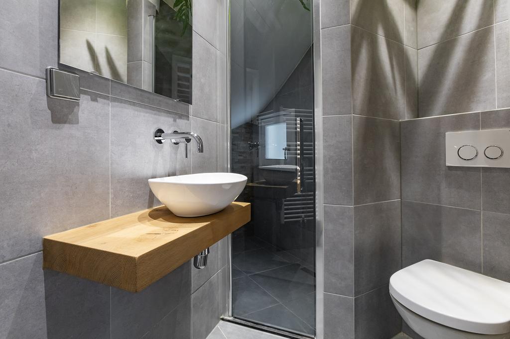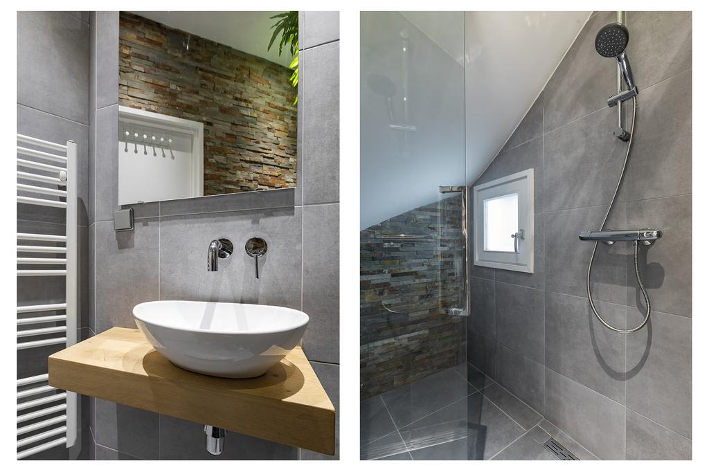 This apartment not only has a modern appearance but also a rich history. The building was originally a small shop and has a charming detail: behind a white plasterboard on the stone wall hides an old door. This door used to lead to the former living space, a unique reminder of the building’s original function.