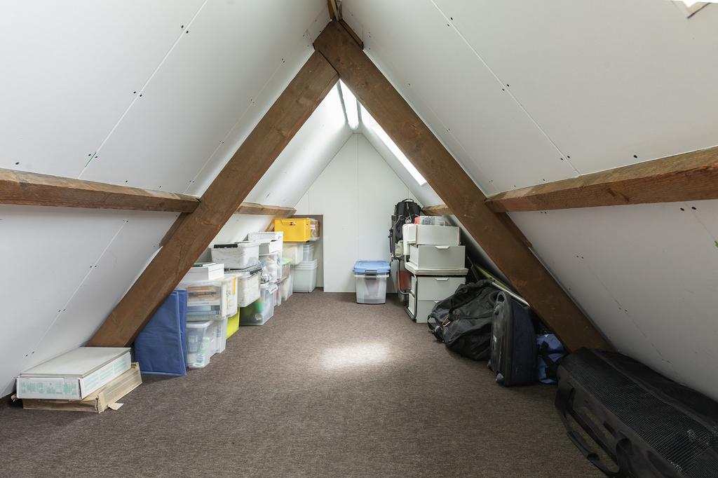 Upstairs, you’ll find two comfortable bedrooms and a modern bathroom with a walk-in shower and toilet. A second separate toilet is located on the landing. The spacious rooms offer options for a peaceful night’s sleep or a stylish workspace. The attic, accessible via a loft ladder, provides enough space for a double bed or extra storage. This flexible layout makes the home ideal for both families and couples.