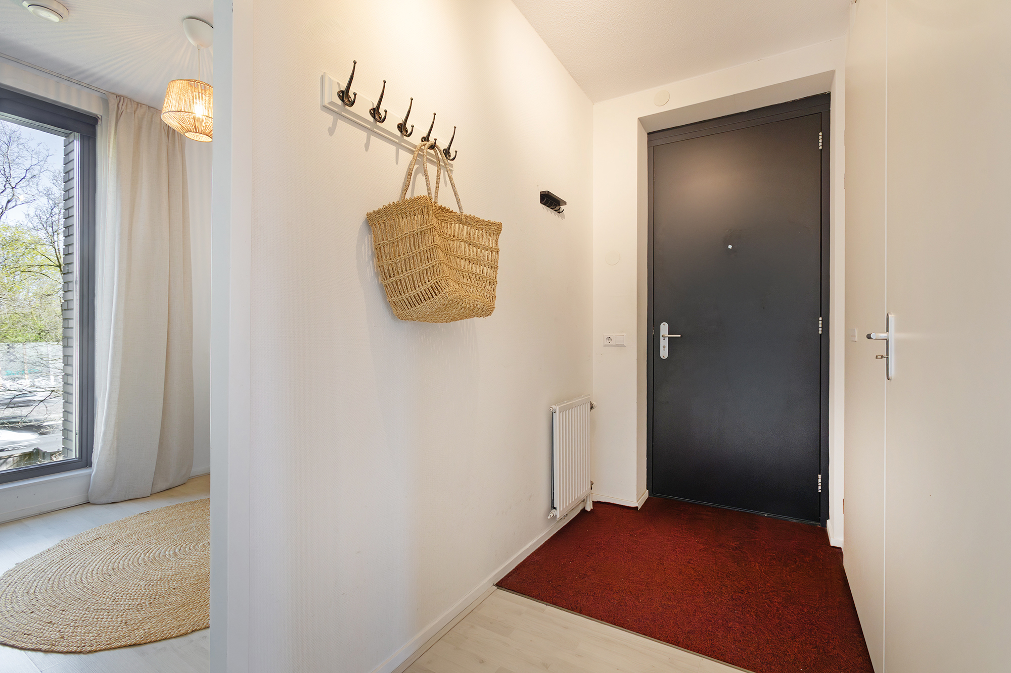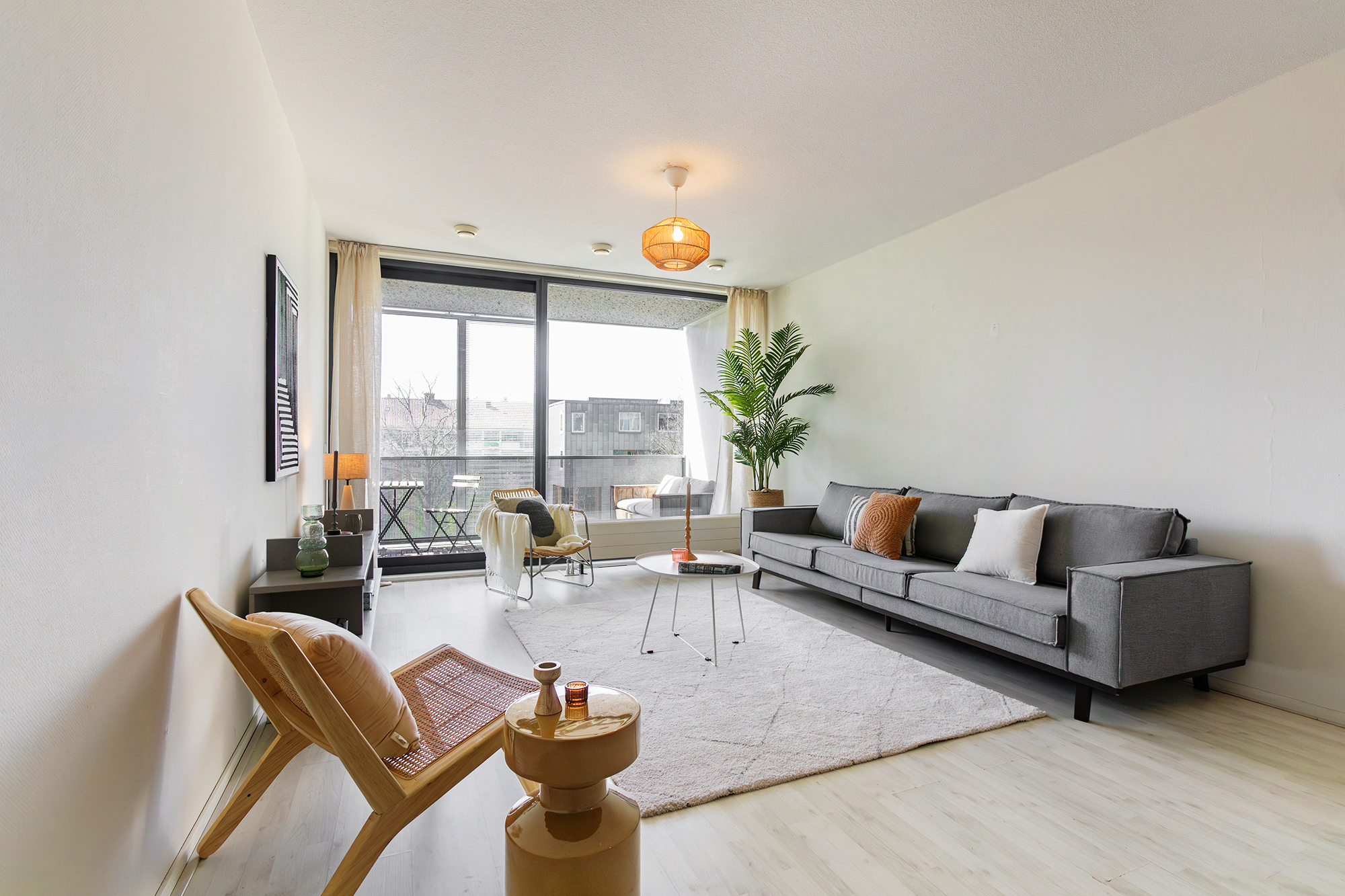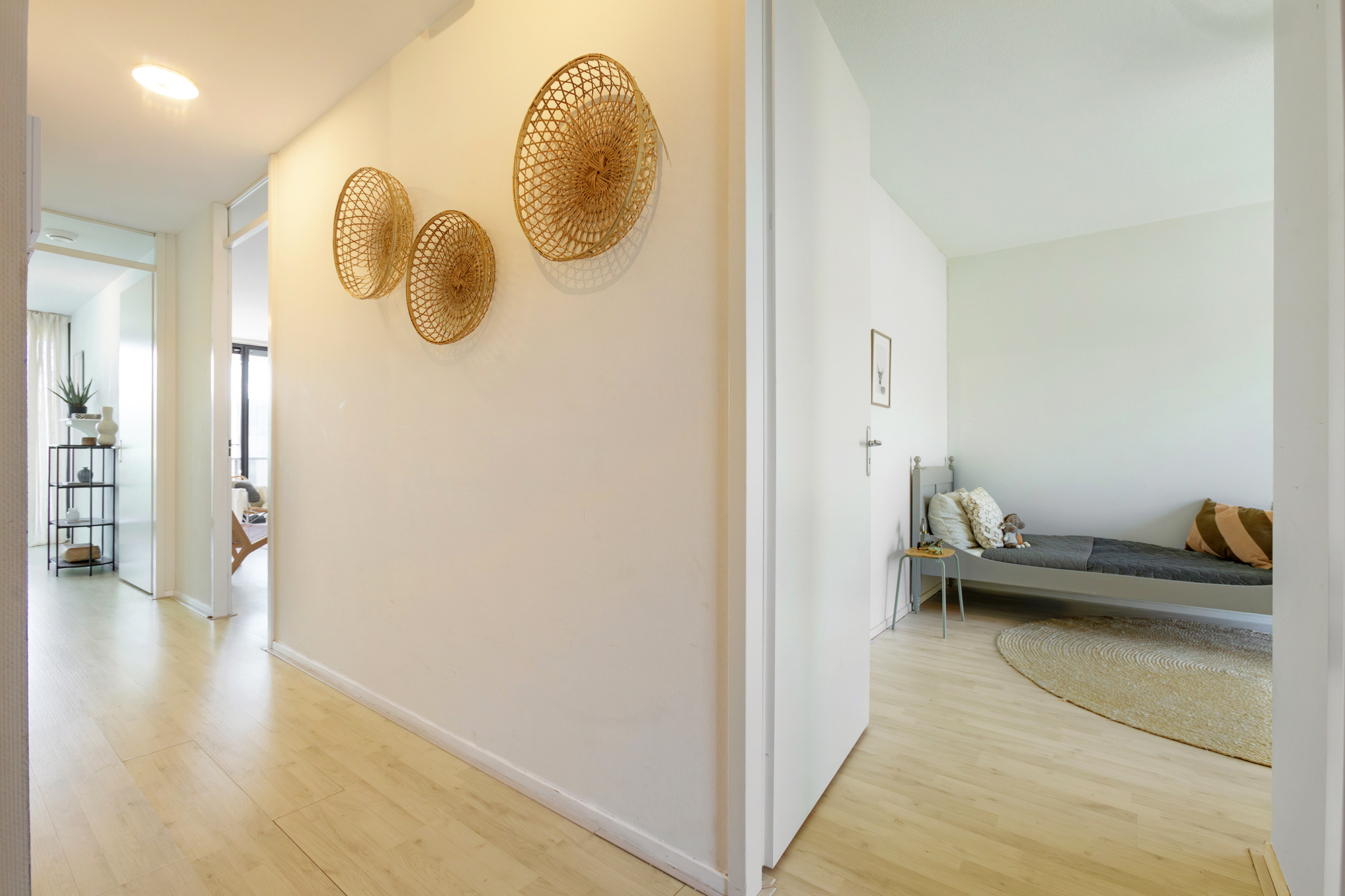 You enter into a spacious hallway with access to all rooms. The rectangular living room is at the front and is openly connected to the kitchen. Thanks to the large glass sliding door, the light here is particularly pleasant. From the living room you step right onto the wide terrace — a lovely spot where you can enjoy the sun from midday until the evening. The largest bedroom also gives access to the terrace.