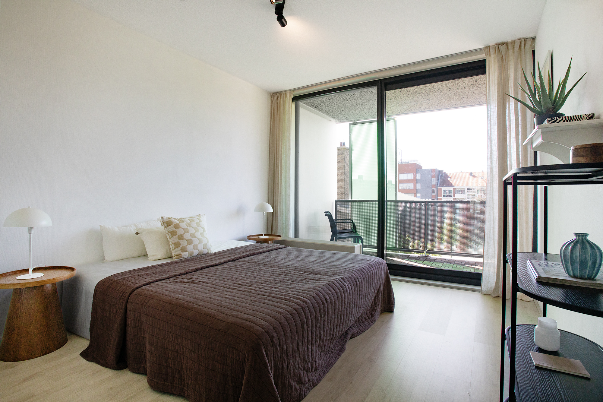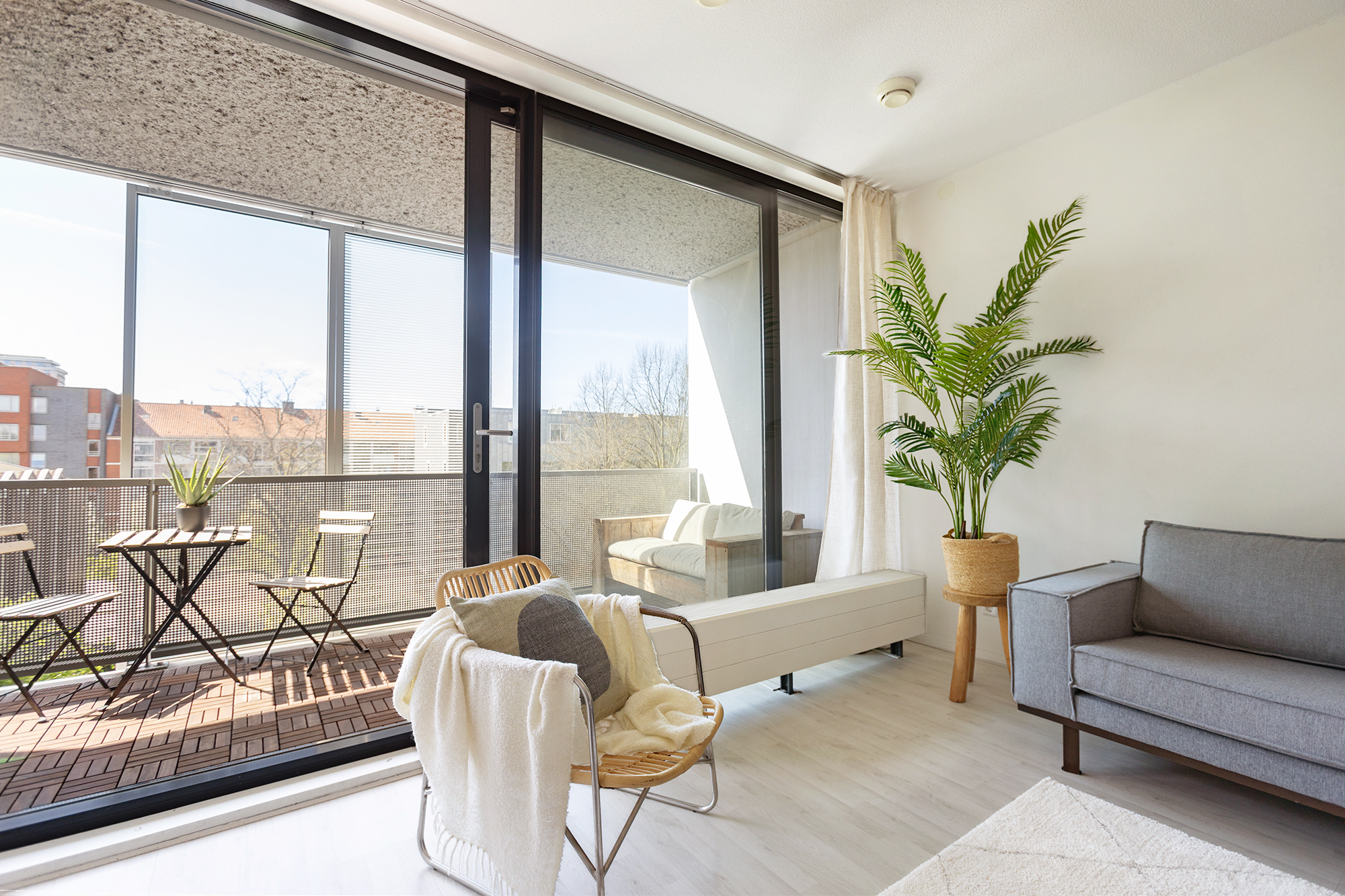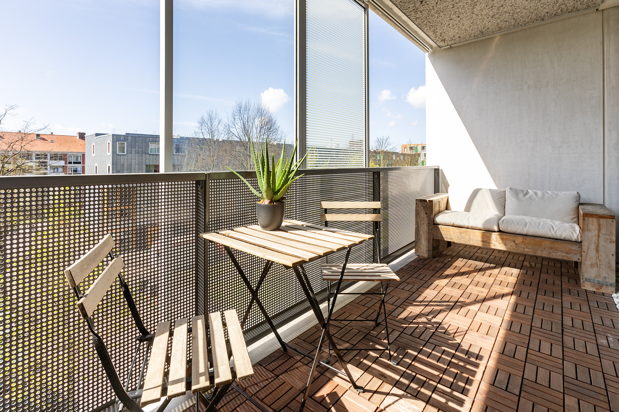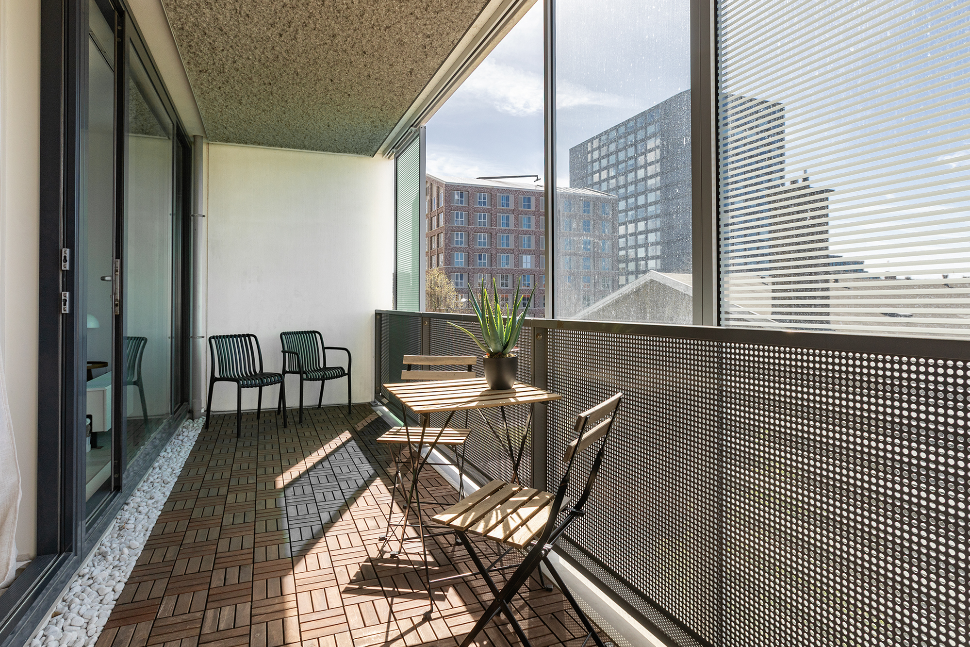 The terrace of 13 m² runs the full width of the apartment and is accessible through the sliding doors of both the living room and one of the bedrooms. The west-facing position means you get sun here from noon until sunset. There are three movable sunshades from floor to ceiling on the outside of the terrace railing, ideal for warm summer days.