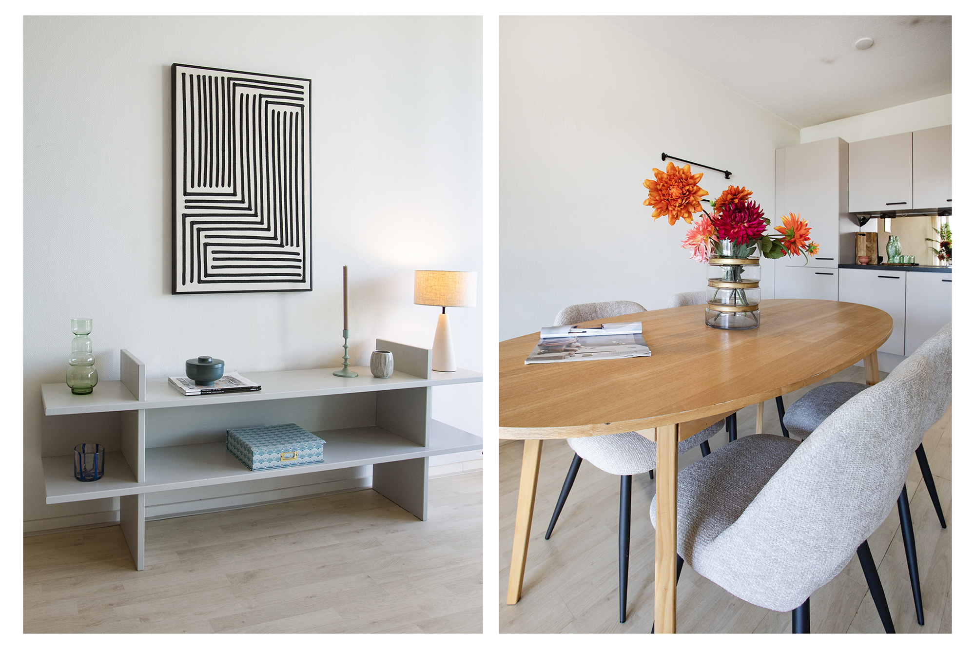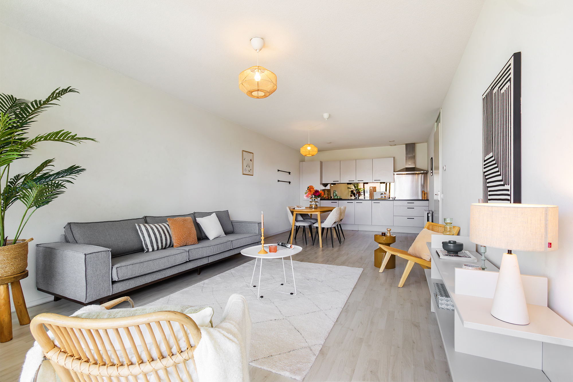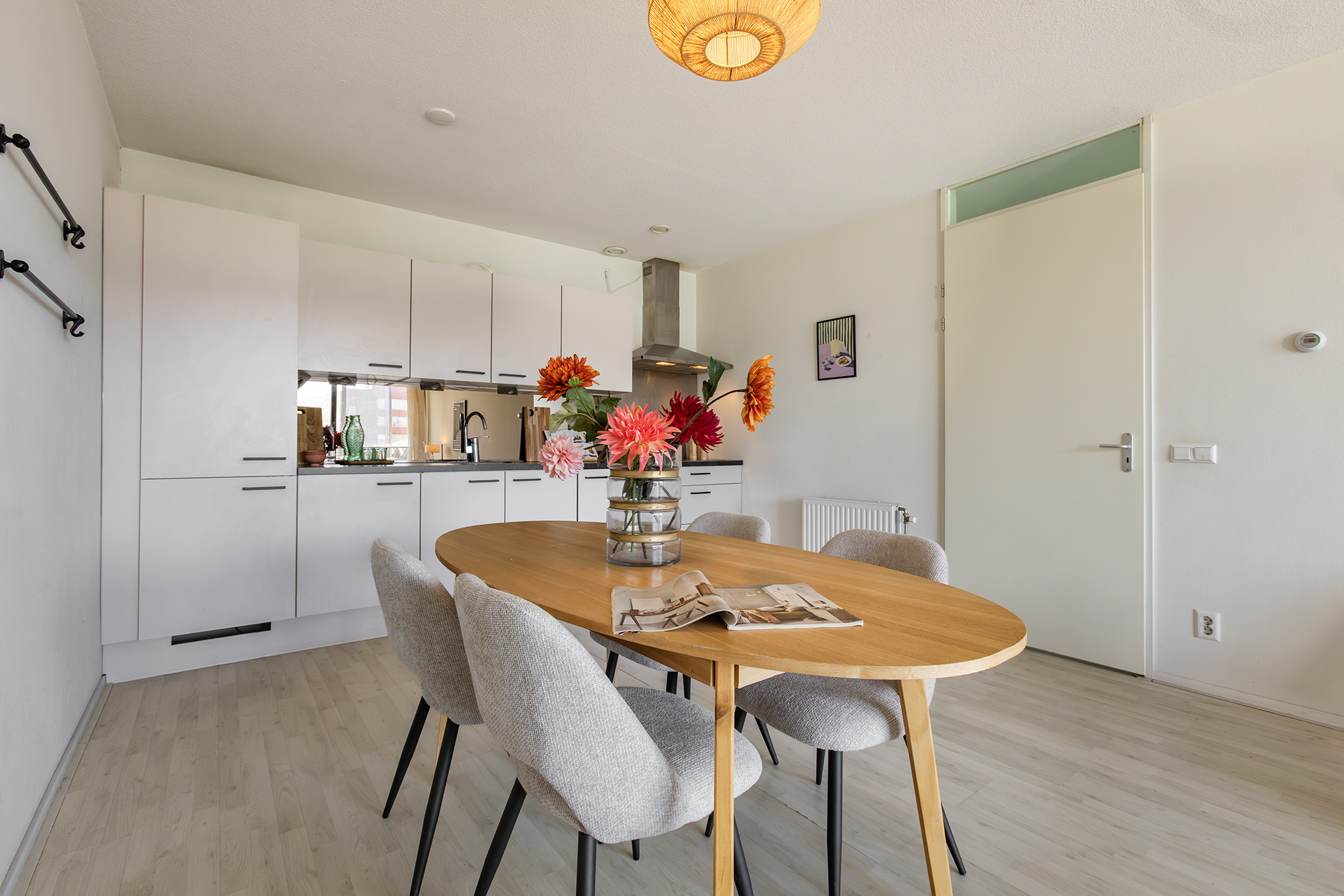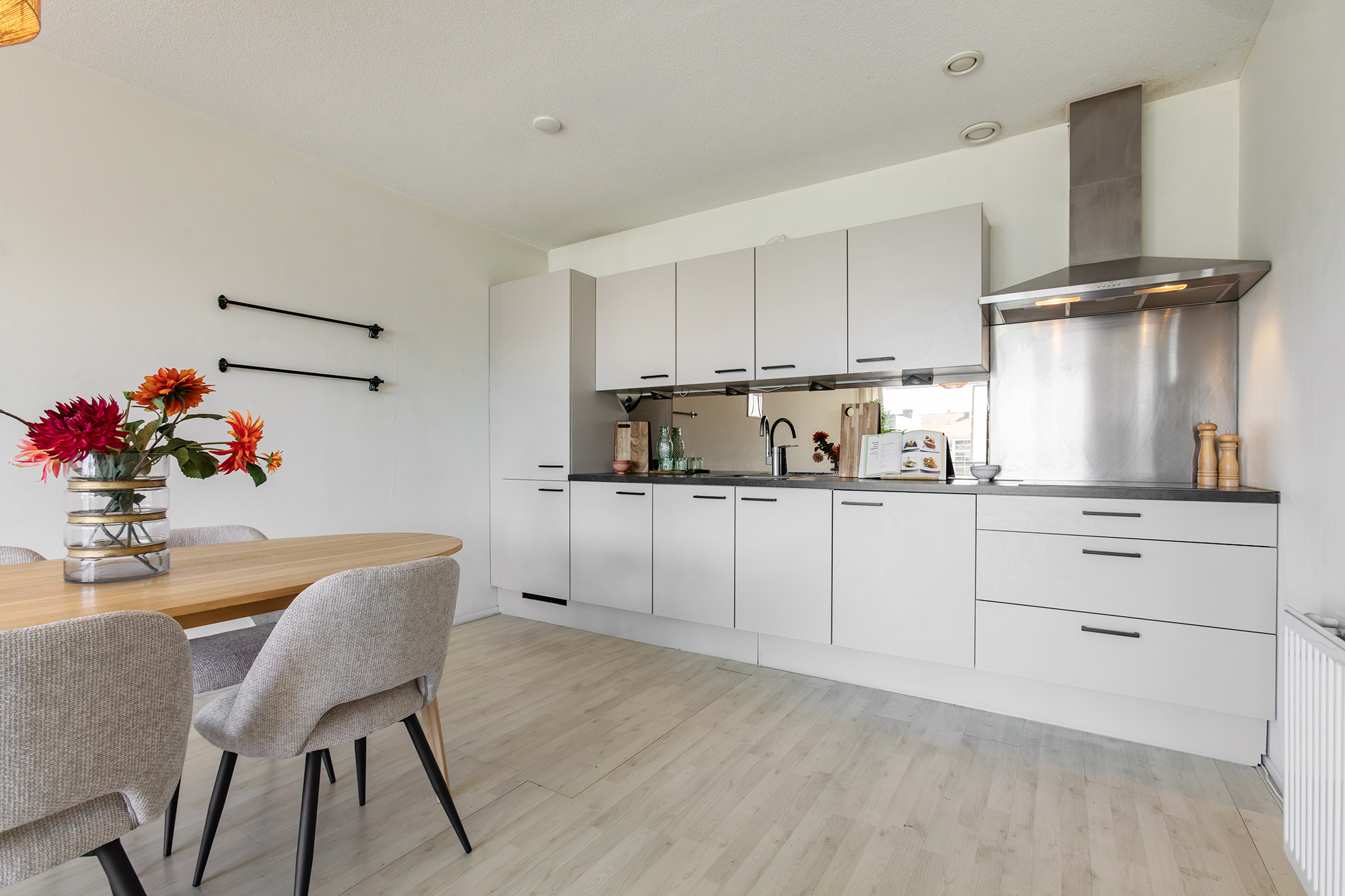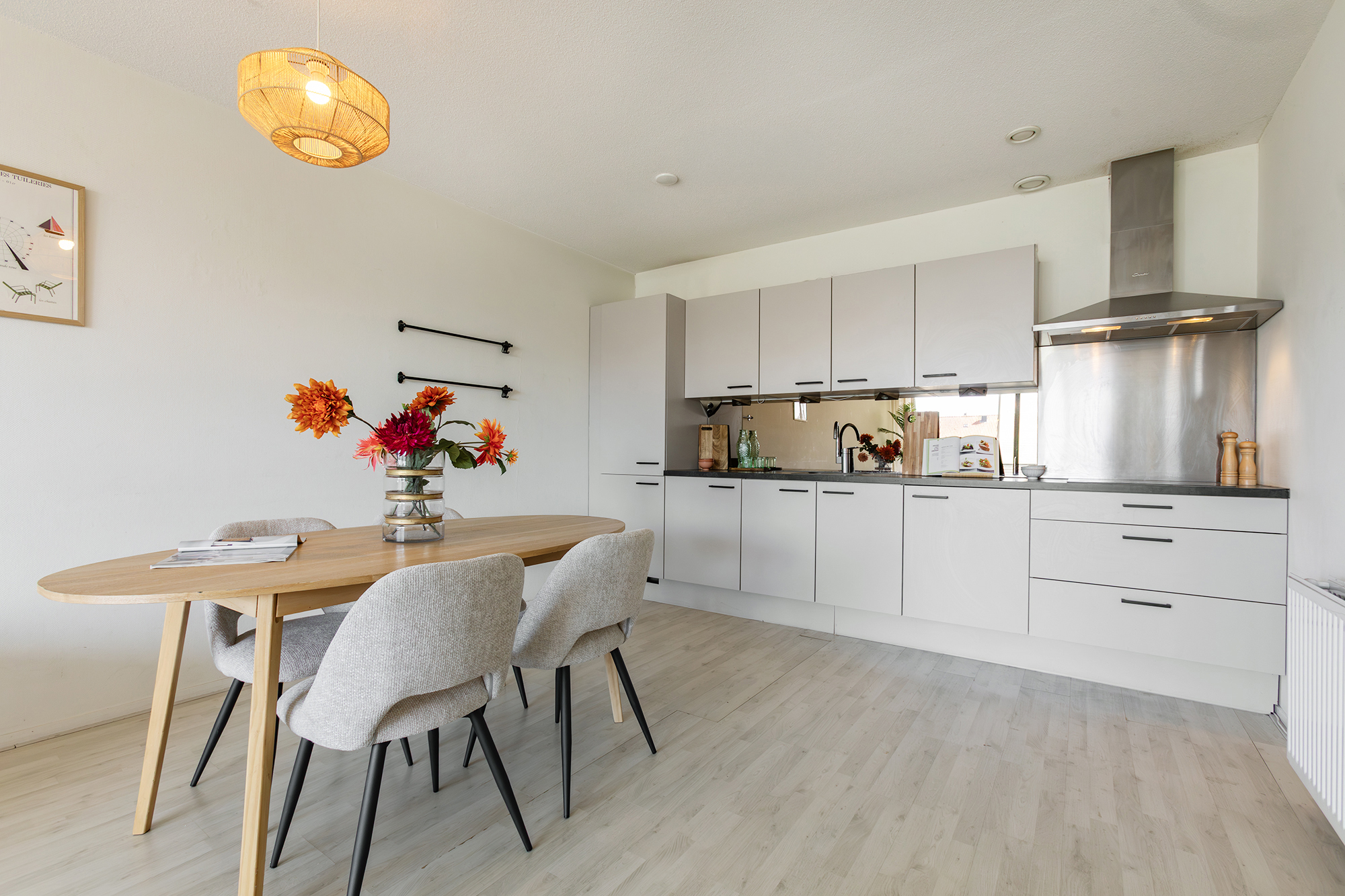 Je komt binnen in een ruime hal met toegang tot alle vertrekken. De rechthoekige woonkamer ligt aan de voorzijde en staat in open verbinding met de keuken. Dankzij de grote glazen schuifpui is de lichtinval hier opvallend prettig. Vanuit de woonkamer stap je zo het brede terras op — een fijne plek waar je vanaf de middag tot in de avond van de zon kunt genieten. Ook vanuit de grootste slaapkamer heb je toegang tot het terras. De keuken is goed verlicht en voorzien van inbouwapparatuur, waaronder een elektrische kookplaat, vaatwasser (2022/2023) en koelkast met vriezer. Er is voldoende plek voor een eettafel.