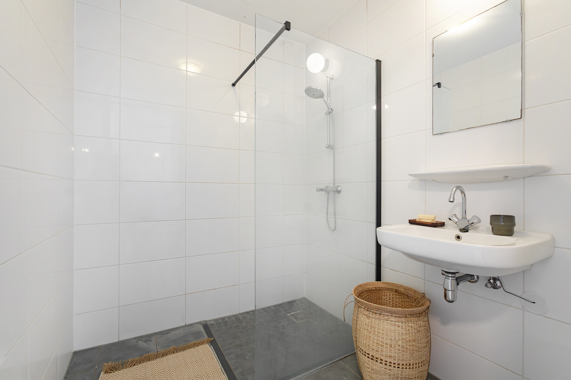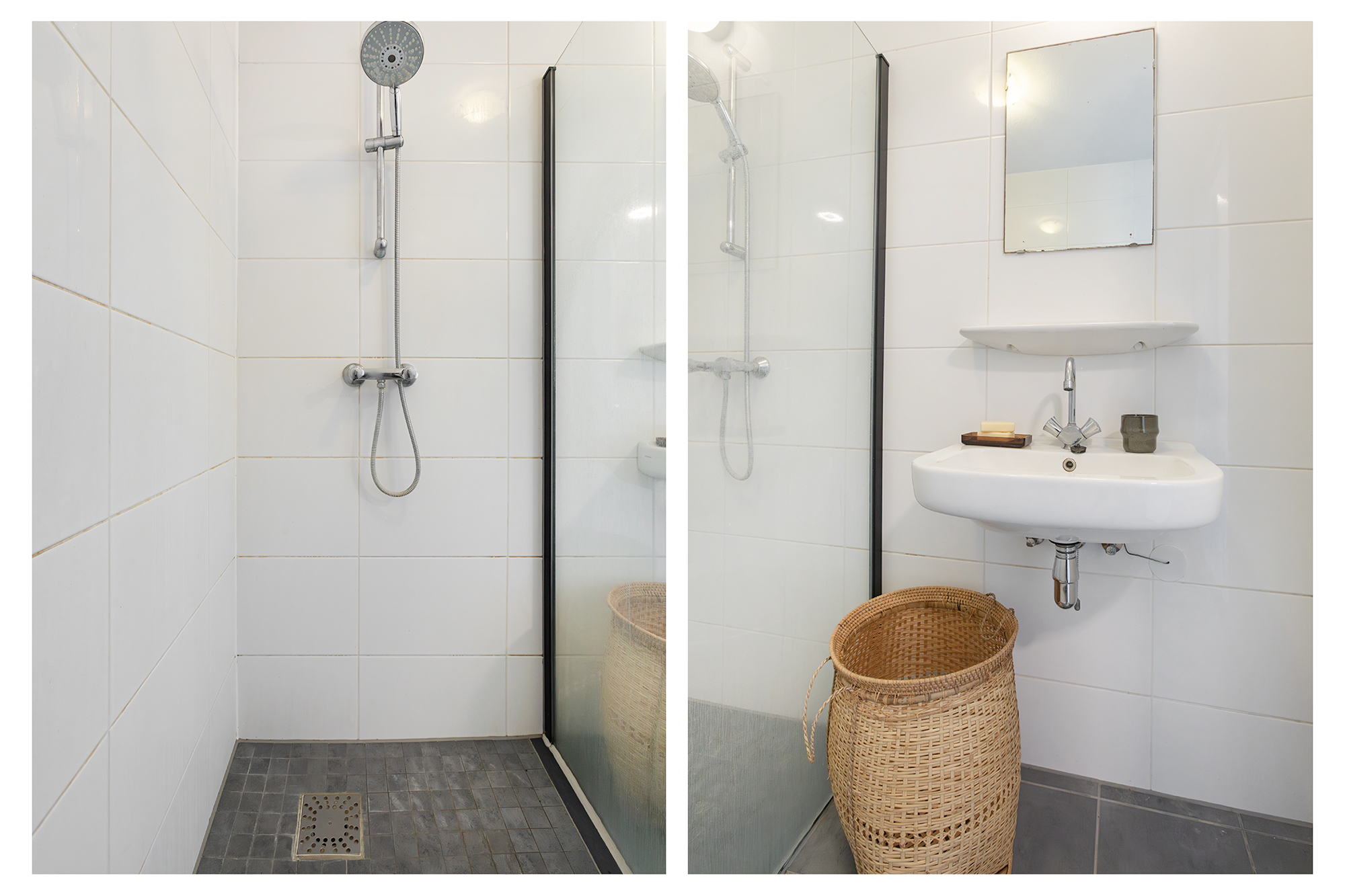 Verder zijn er drie slaapkamers: één grote aan de voorzijde met veel licht, en twee kamers aan de achterzijde, die door de grote ramen ook uitstekend als studeer- of werkruimte gebruikt kunnen worden. De badkamer is netjes en praktisch ingericht met een douche en wastafel. Het toilet is apart. Tot slot is er nog een interne bergkast met ruime plek voor de nevenopstelling van wasmachine en droger.